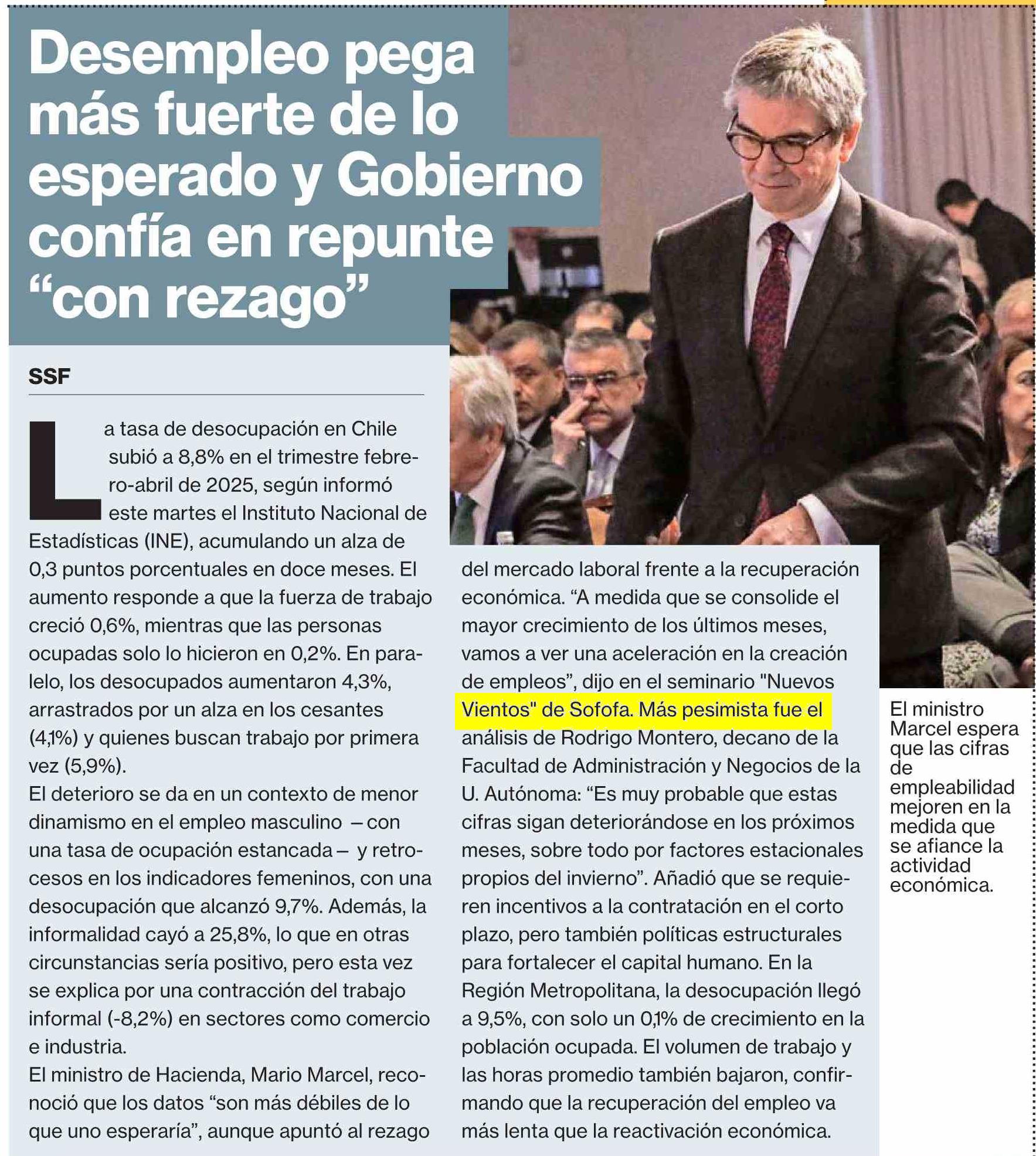 Desempleo pega más fuerte de lo esperado y Gobierno confía en repunte "con rezago" 29-05-2025 La Segunda |