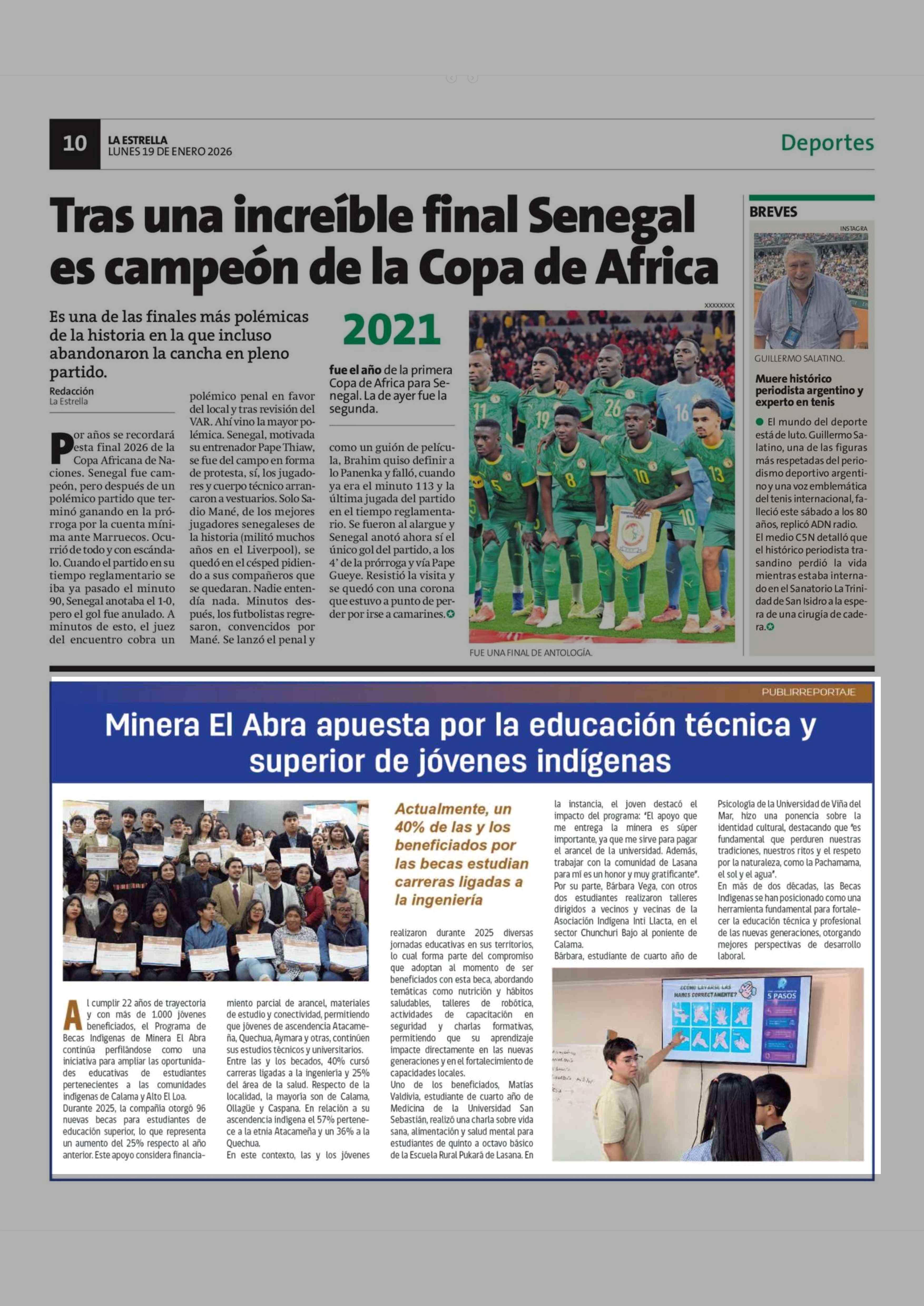 Minera El Abra apuesta por la educación técnica y superior de jóvenes indígenas 19-01-2026 La Estrella de Antofagasta |