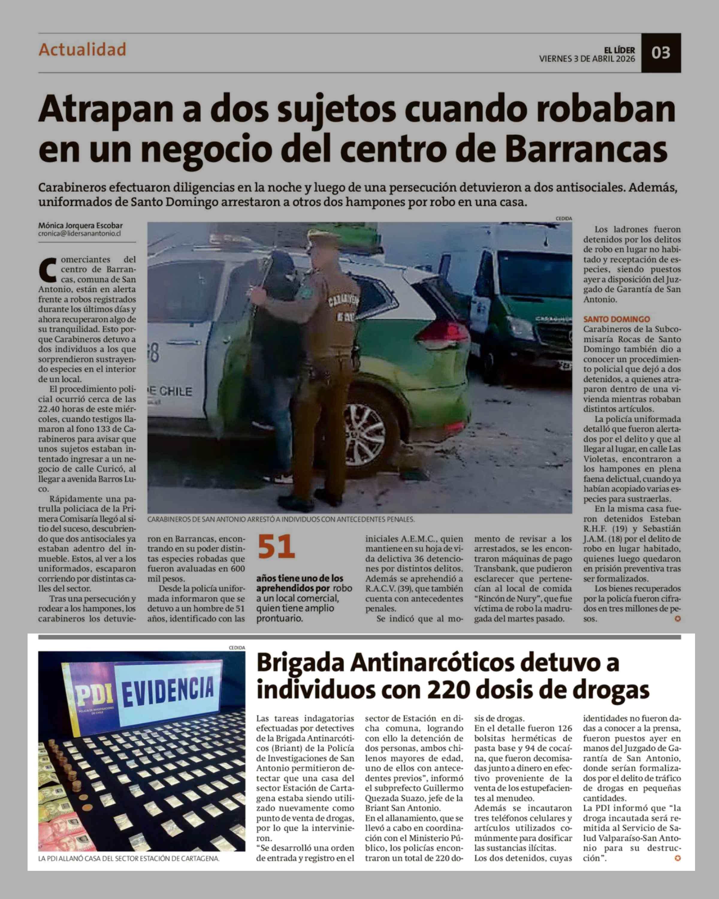 Título: Brigada Antinarcóticos detuvo a individuos con 220 dosis de drogas