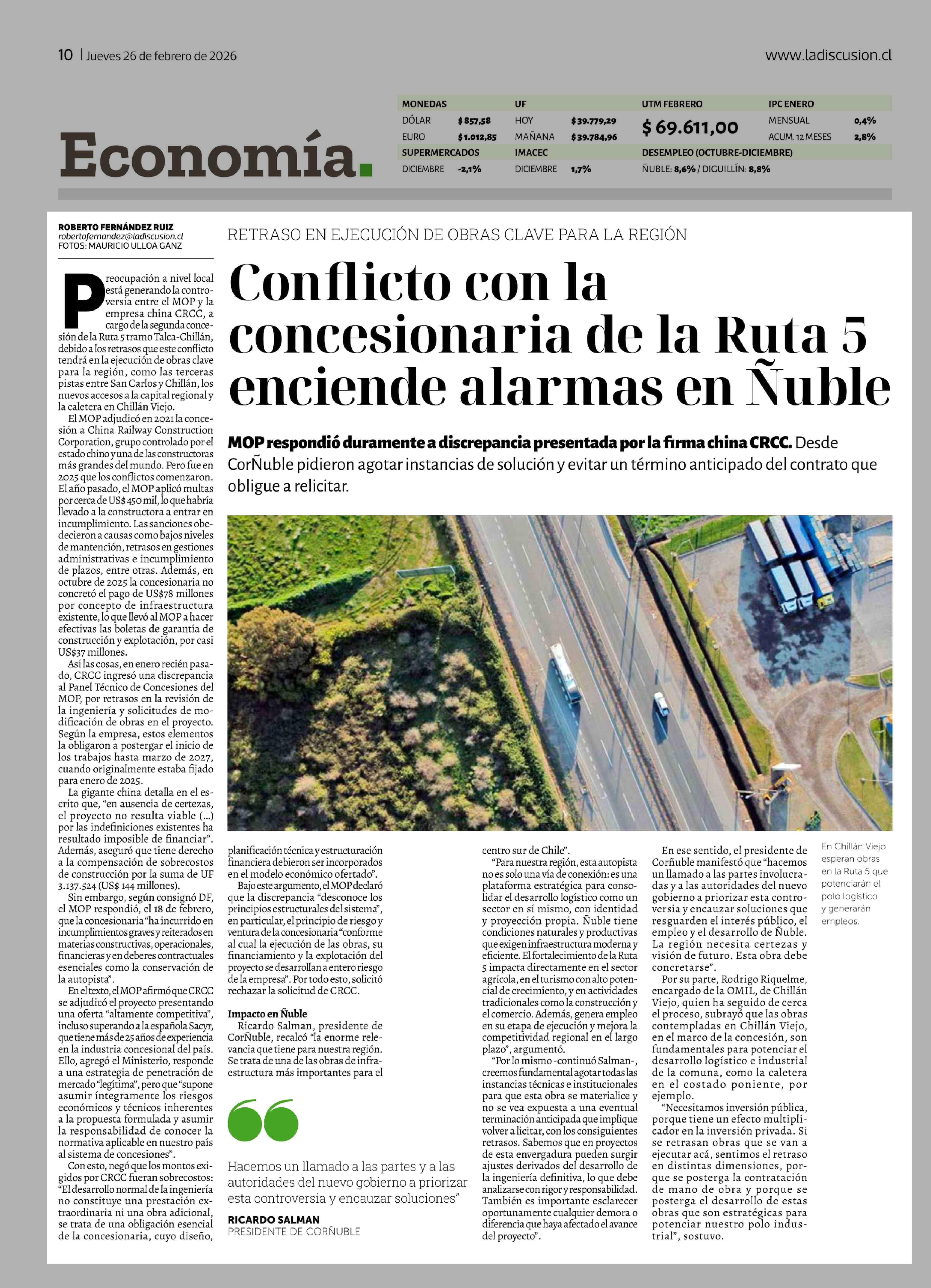 Conflicto con la concesionaria de la Ruta 5 enciende alarmas en Ñuble 26-02-2026 La Discusión |