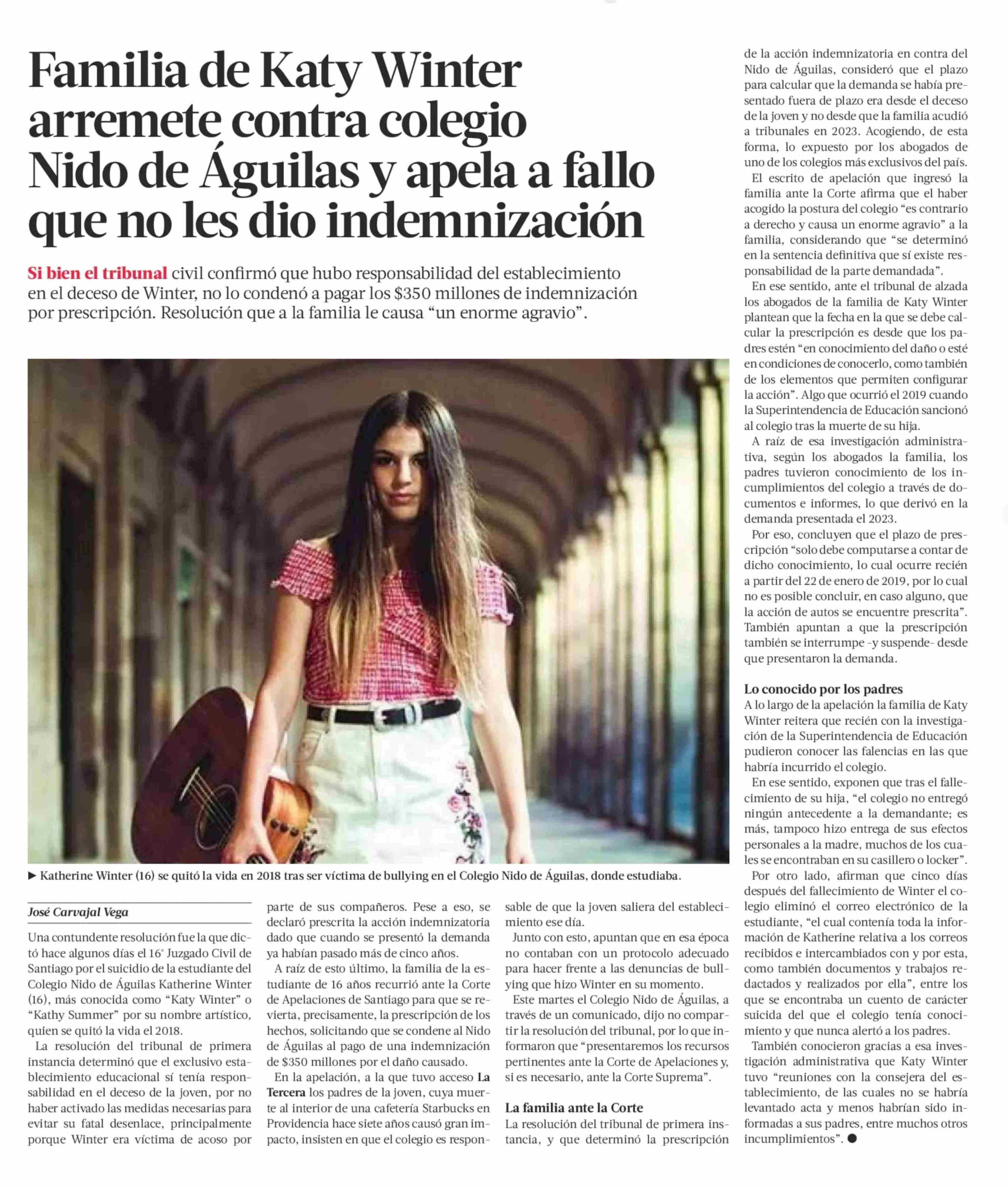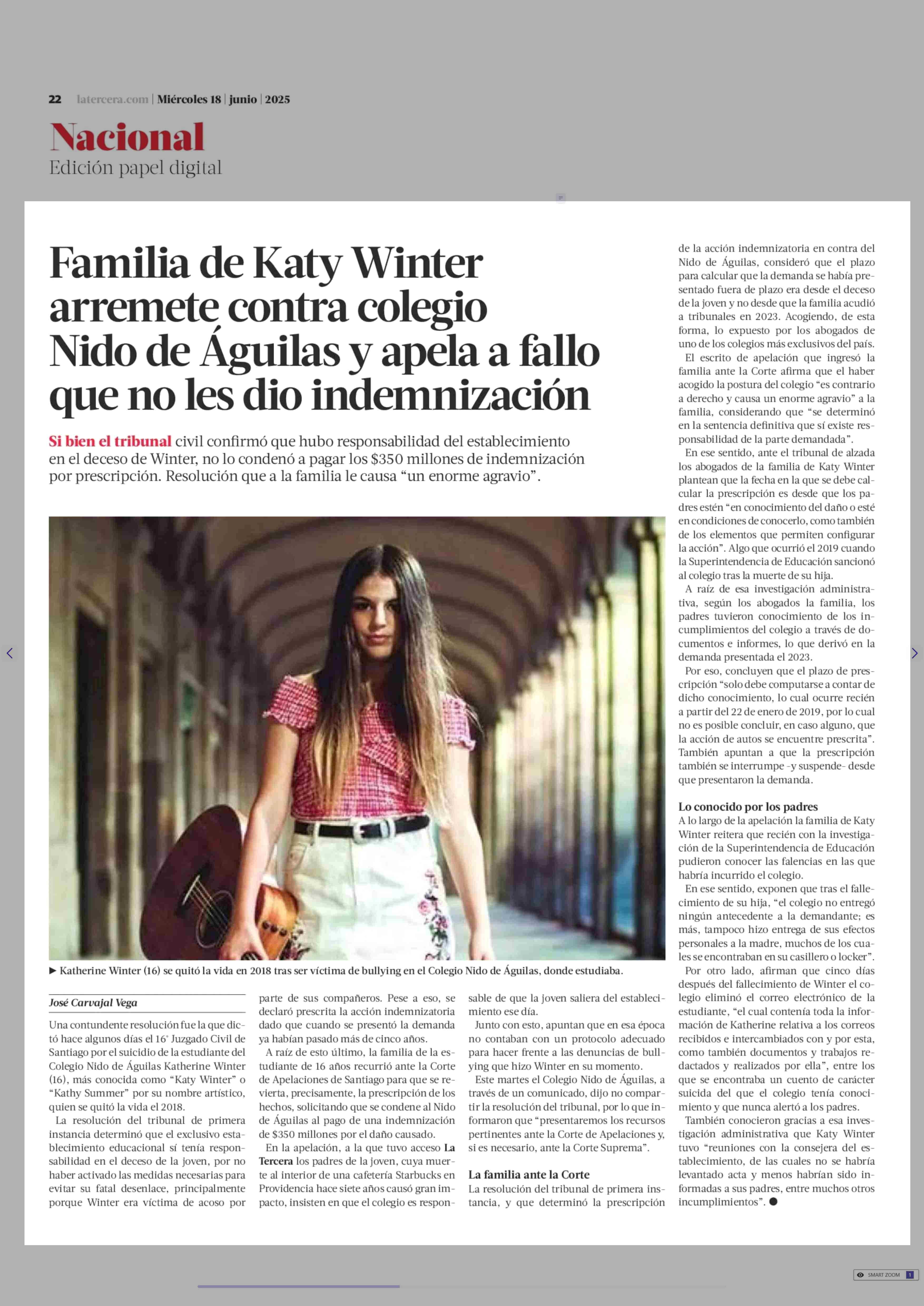 Familia de Katy Winter arremete contra colegio Nido de Águilas y apela a fallo que no les dio indemnización 18-06-2025 La Tercera |