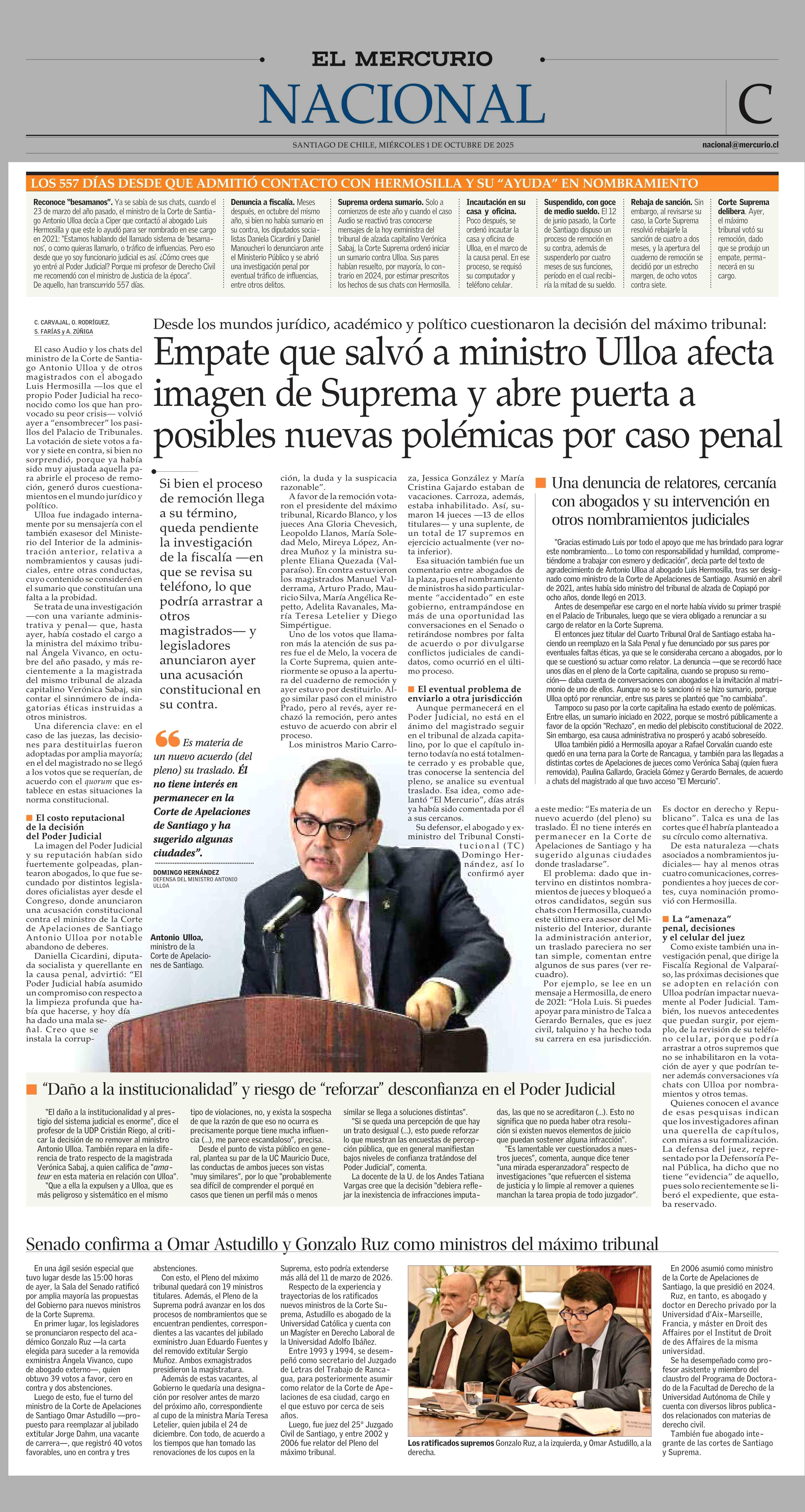 Empate que salvó a ministro Ulloa afecta imagen de Suprema y abre puerta a posibles nuevas polémicas por caso penal 01-10-2025 El Mercurio |
