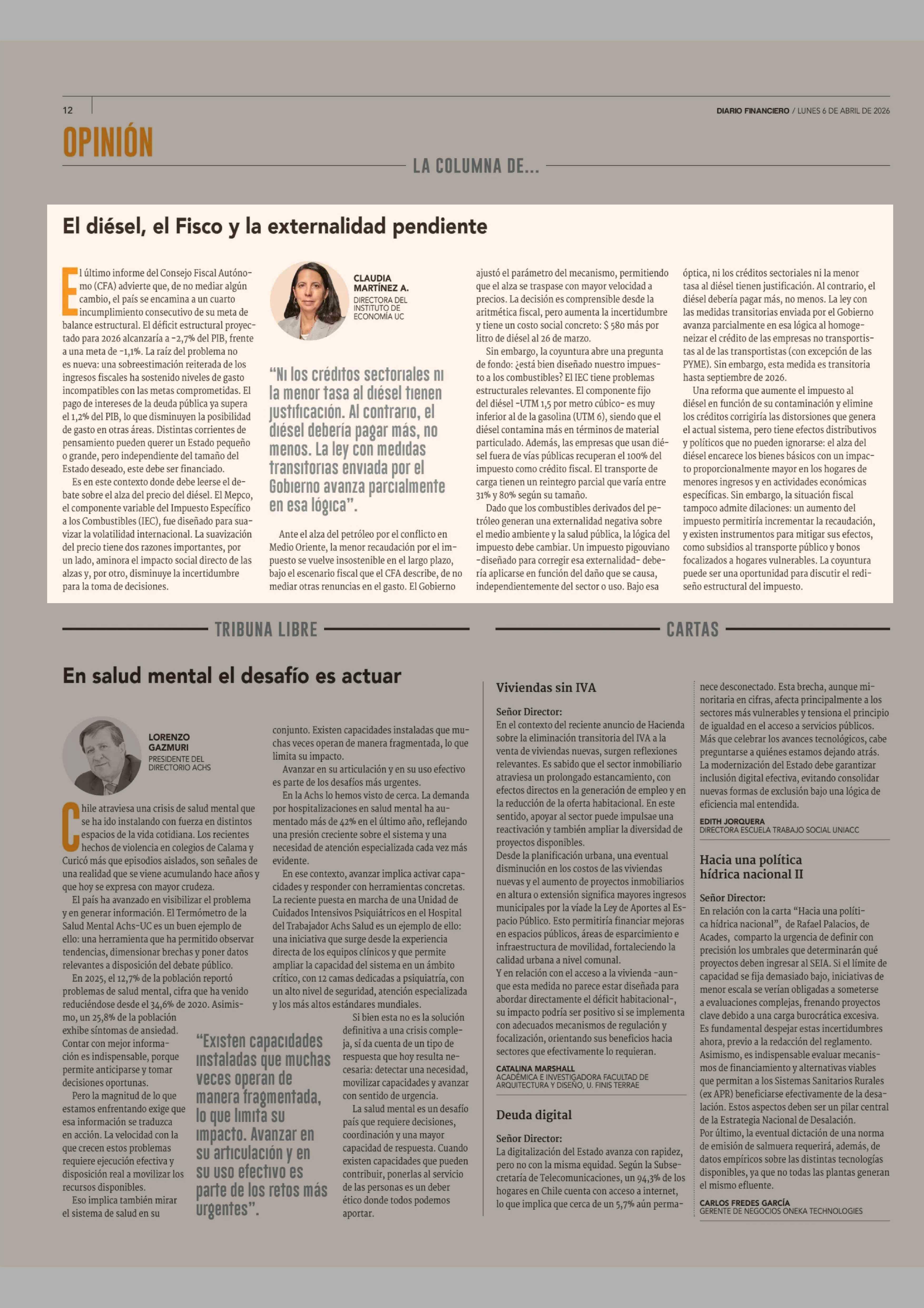 Columnas de Opinión: El diésel, el Fisco y la externalidad pendiente 06-04-2026 Diario Financiero |