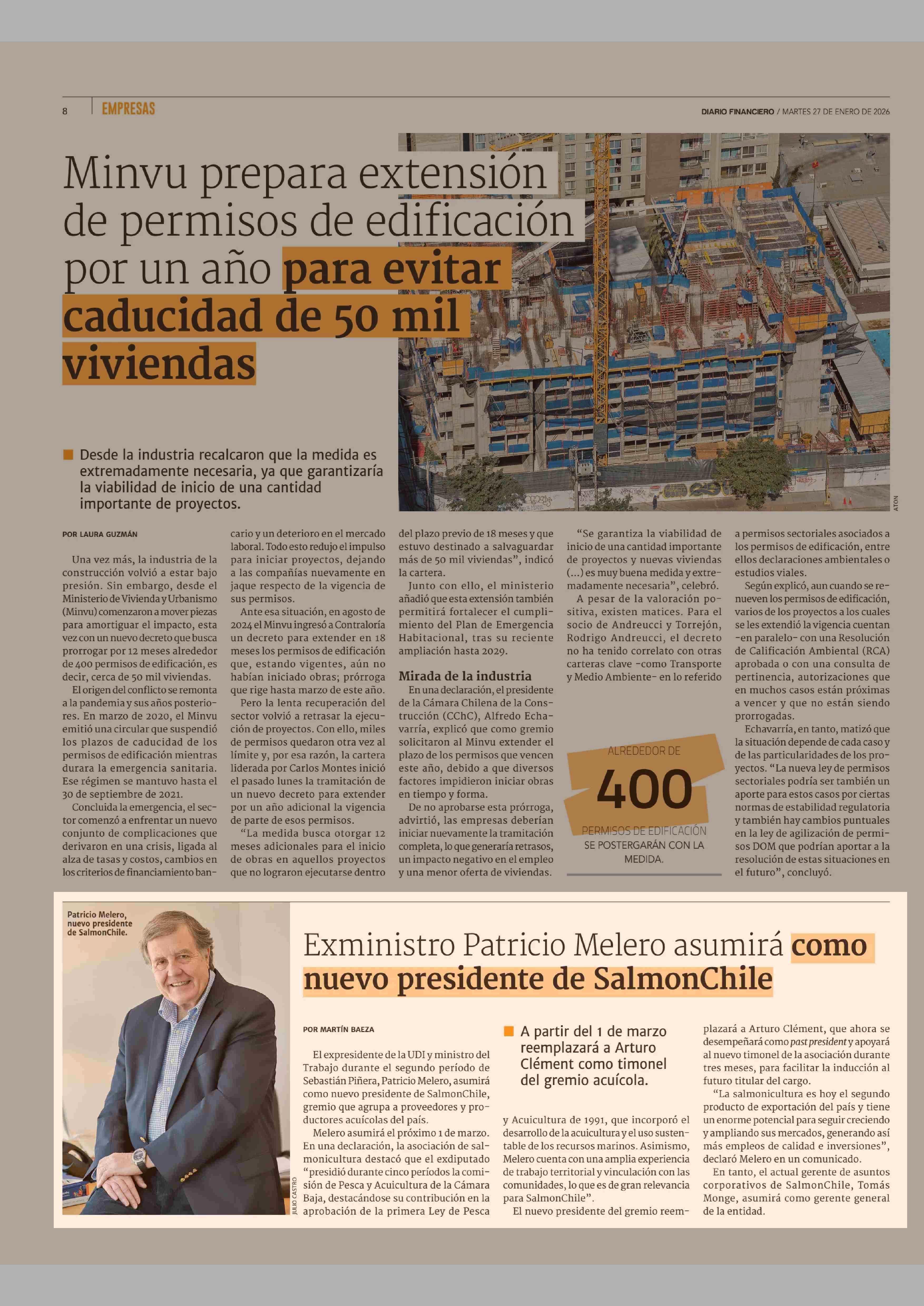Exministro Patricio Melero asumirá como nuevo presidente de SalmonChile 27-01-2026 Diario Financiero |