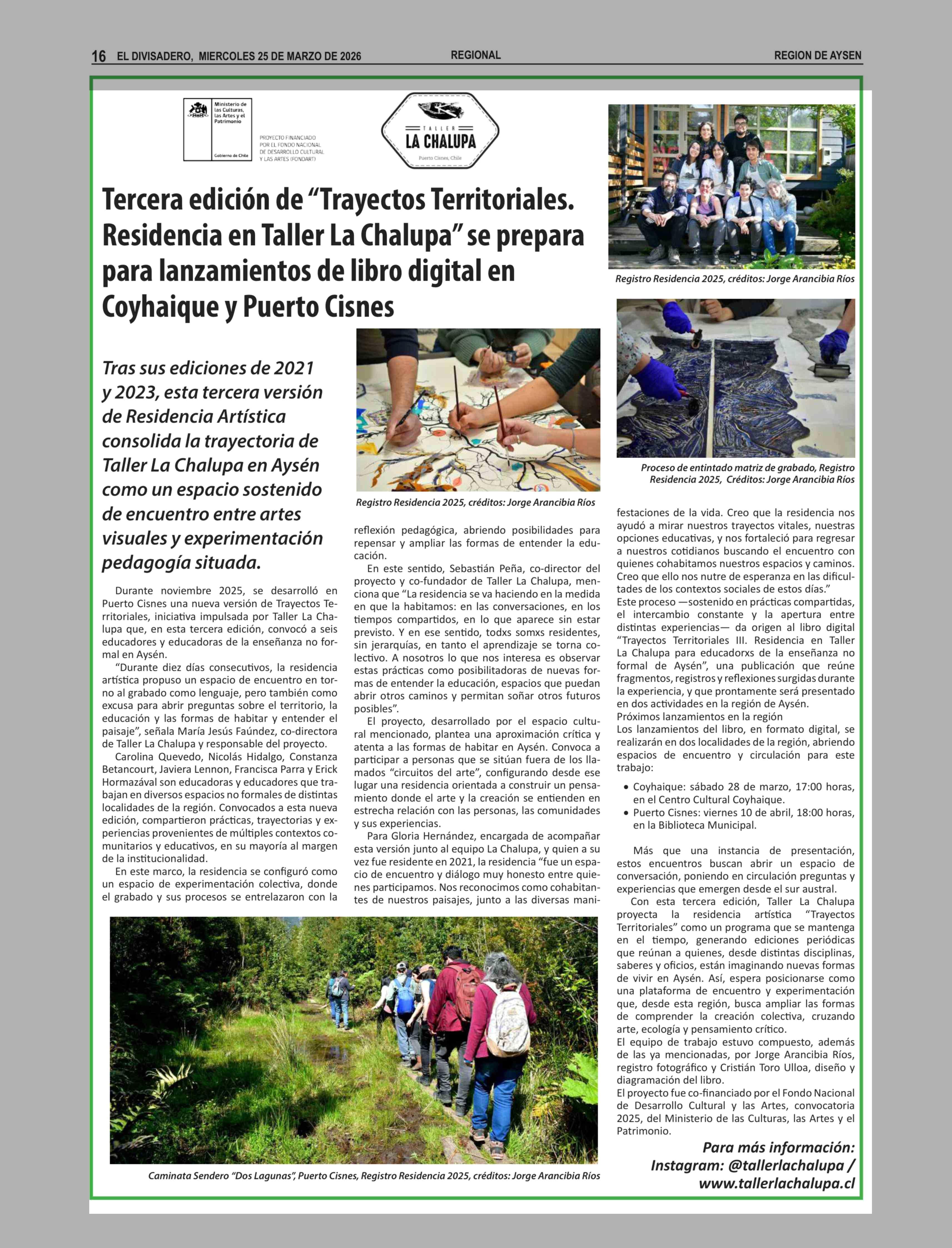 Título: Tercera edición de "Trayectos Territoriales. Residencia en Taller La Chalupa" se prepara para lanzamientos de libro digital en Coyhaique y Puerto Cisnes