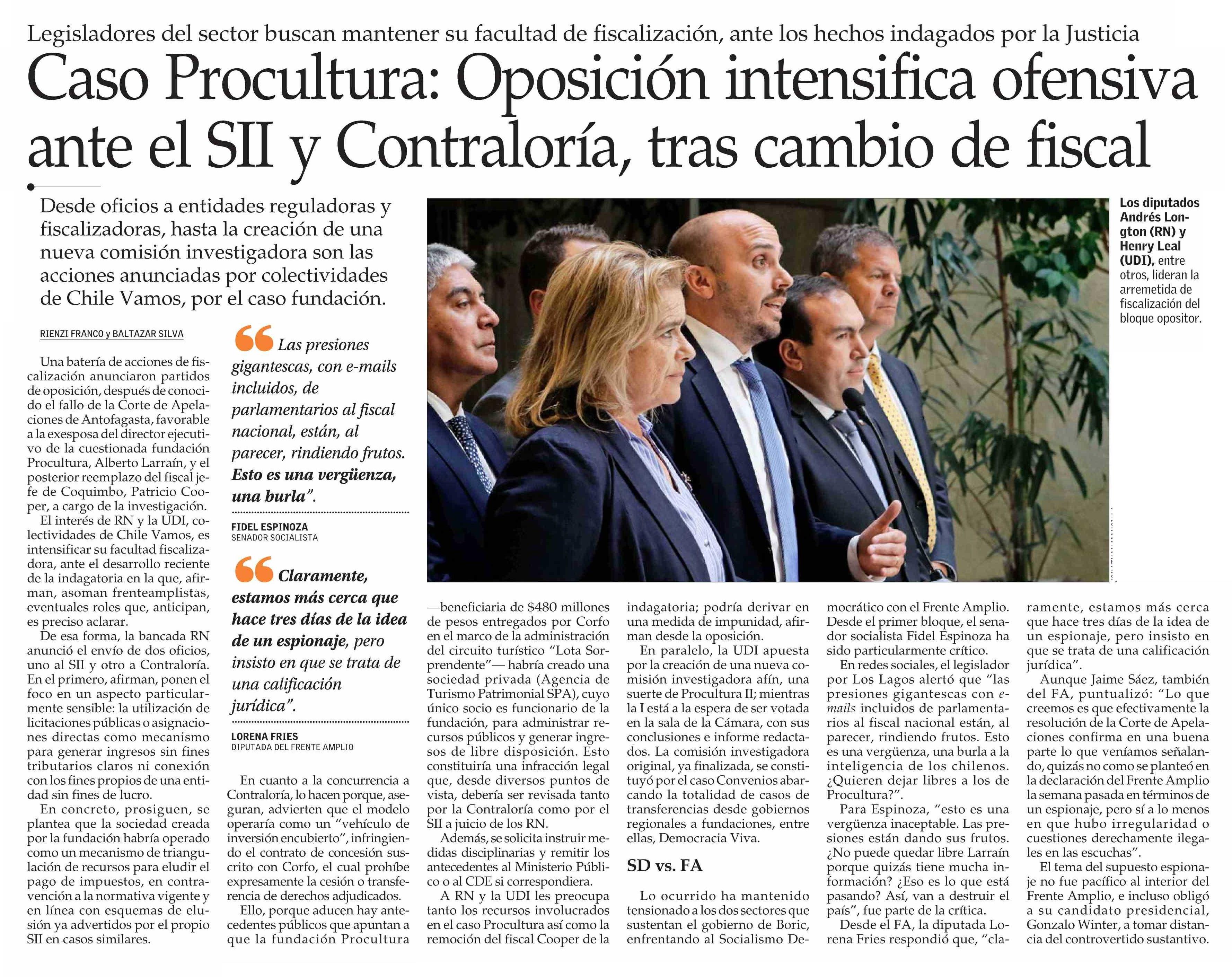 Caso Procultura: Oposición intensifica ofensiva ante el SII y Contraloría, tras cambio de fiscal 18-05-2025 El Mercurio |
