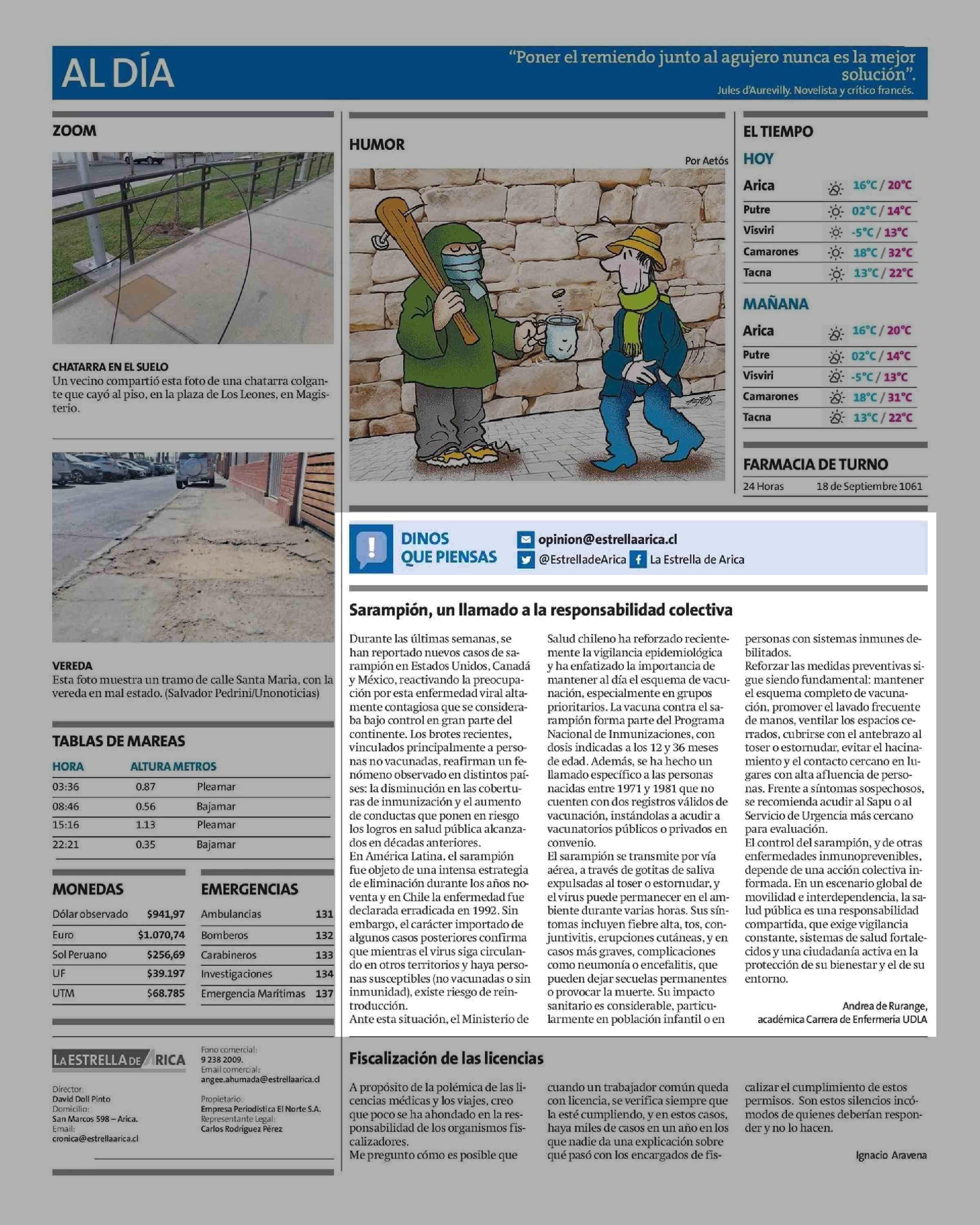 Sarampión, un llamado a la responsabilidad colectiva 03-06-2025 La Estrella de Arica |