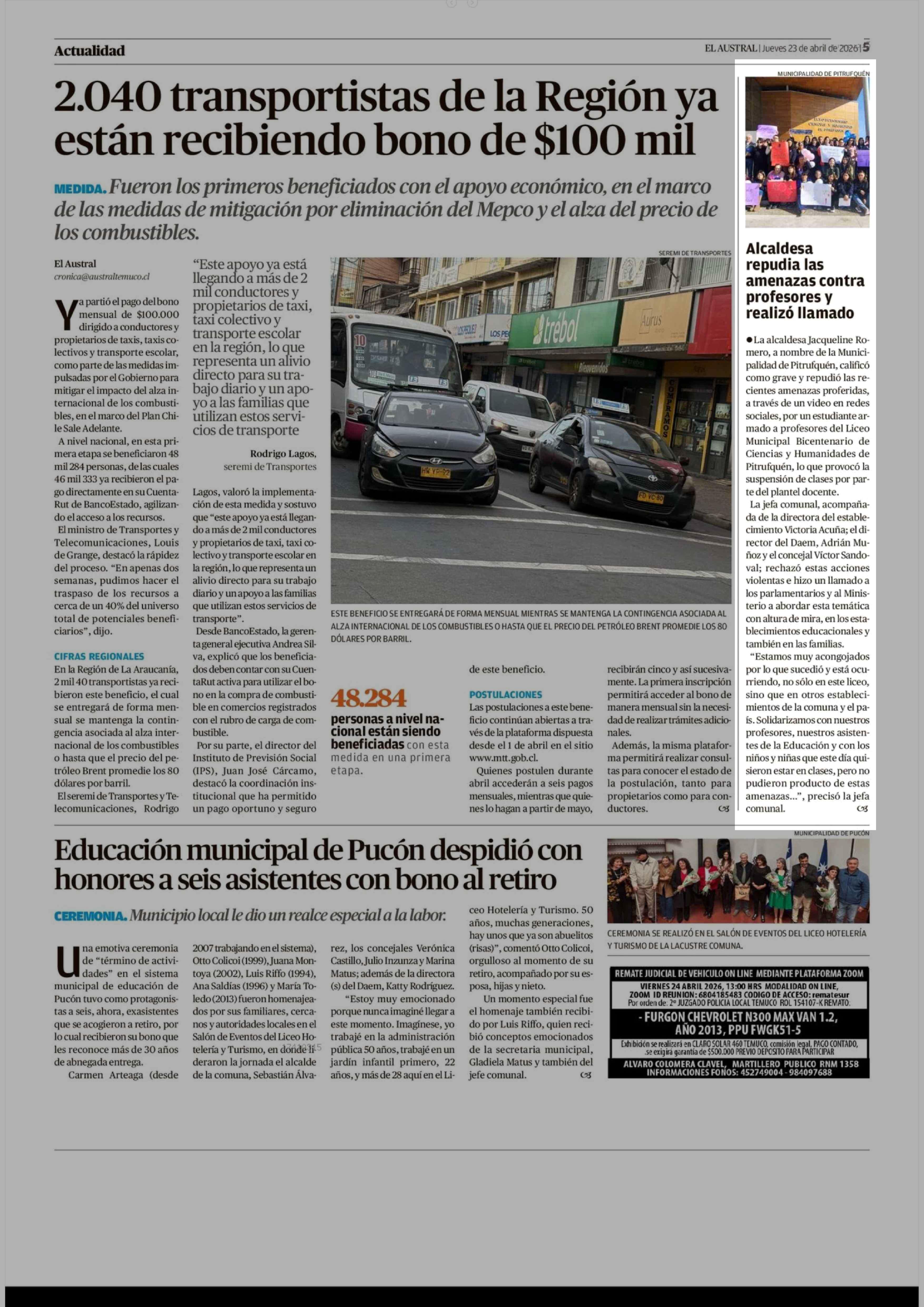 Alcaldesa repudia las amenazas contra profesores y realizó llamado 23-04-2026 El Austral de la Araucanía |