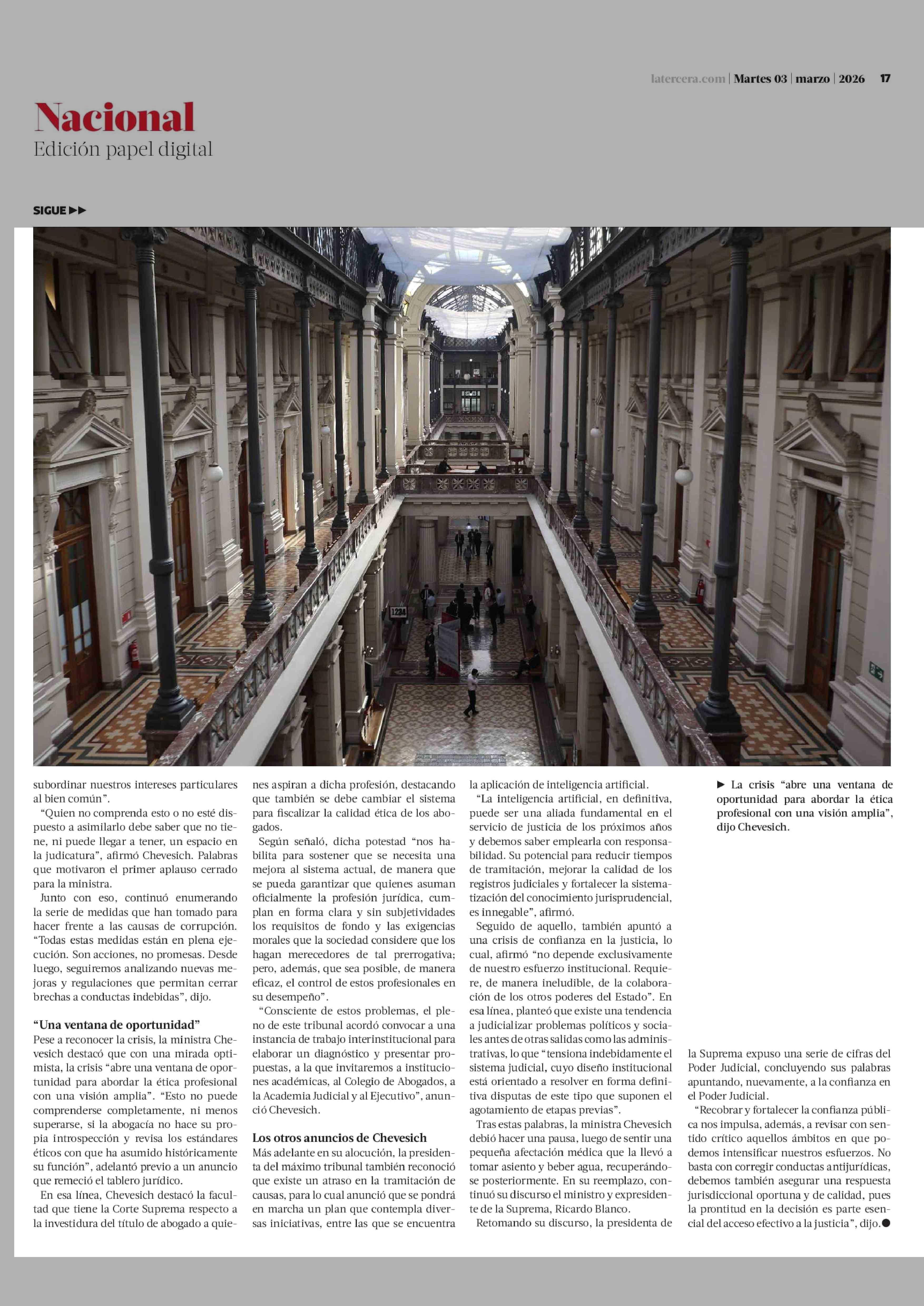 Título: Chevesich hace fuerte llamado a integridad de jueces y anuncia interés de la Suprema por fiscalizar calidad ética de abogados