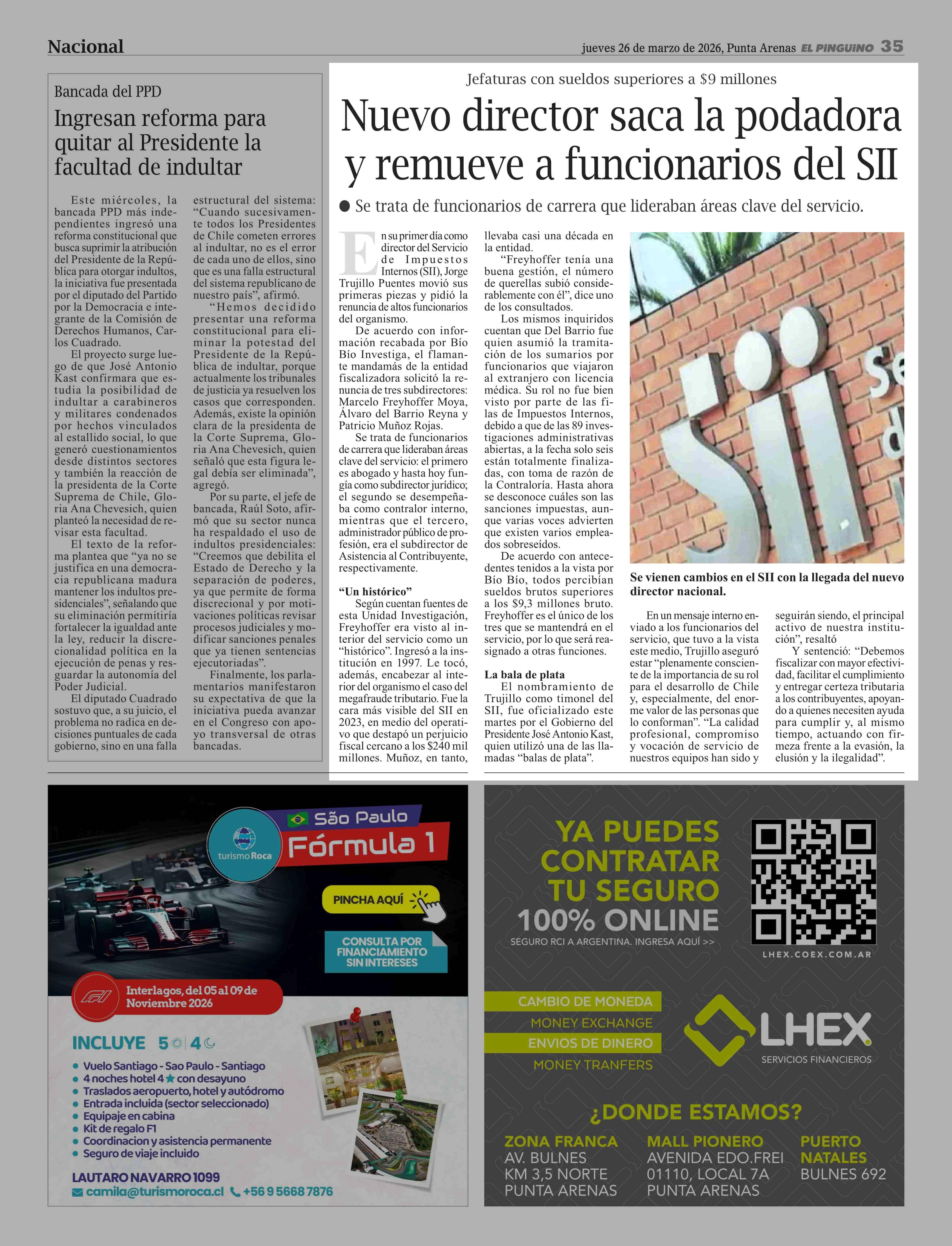 Nuevo director saca la podadora y remueve a funcionarios del SII 26-03-2026 El Pingüino |