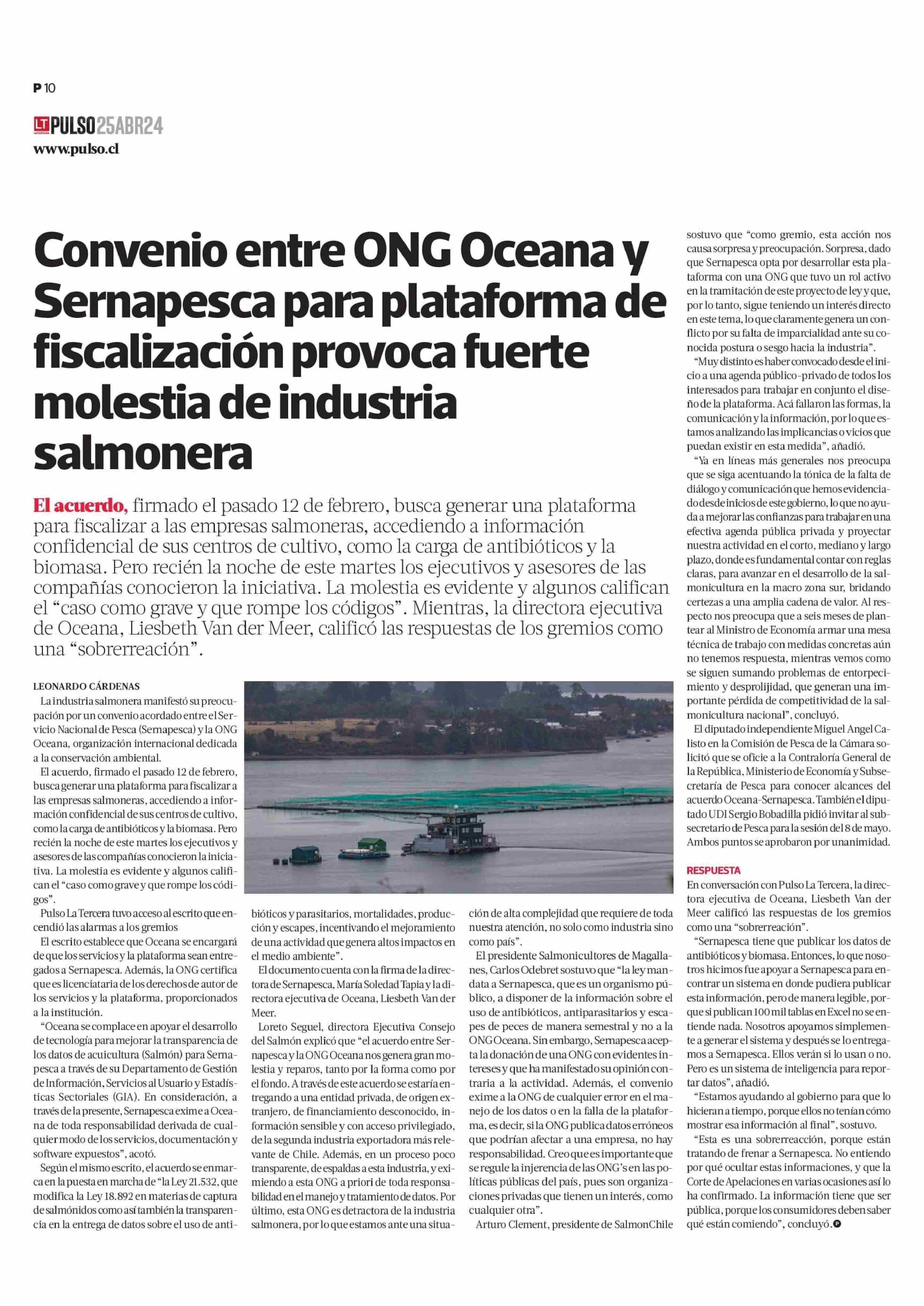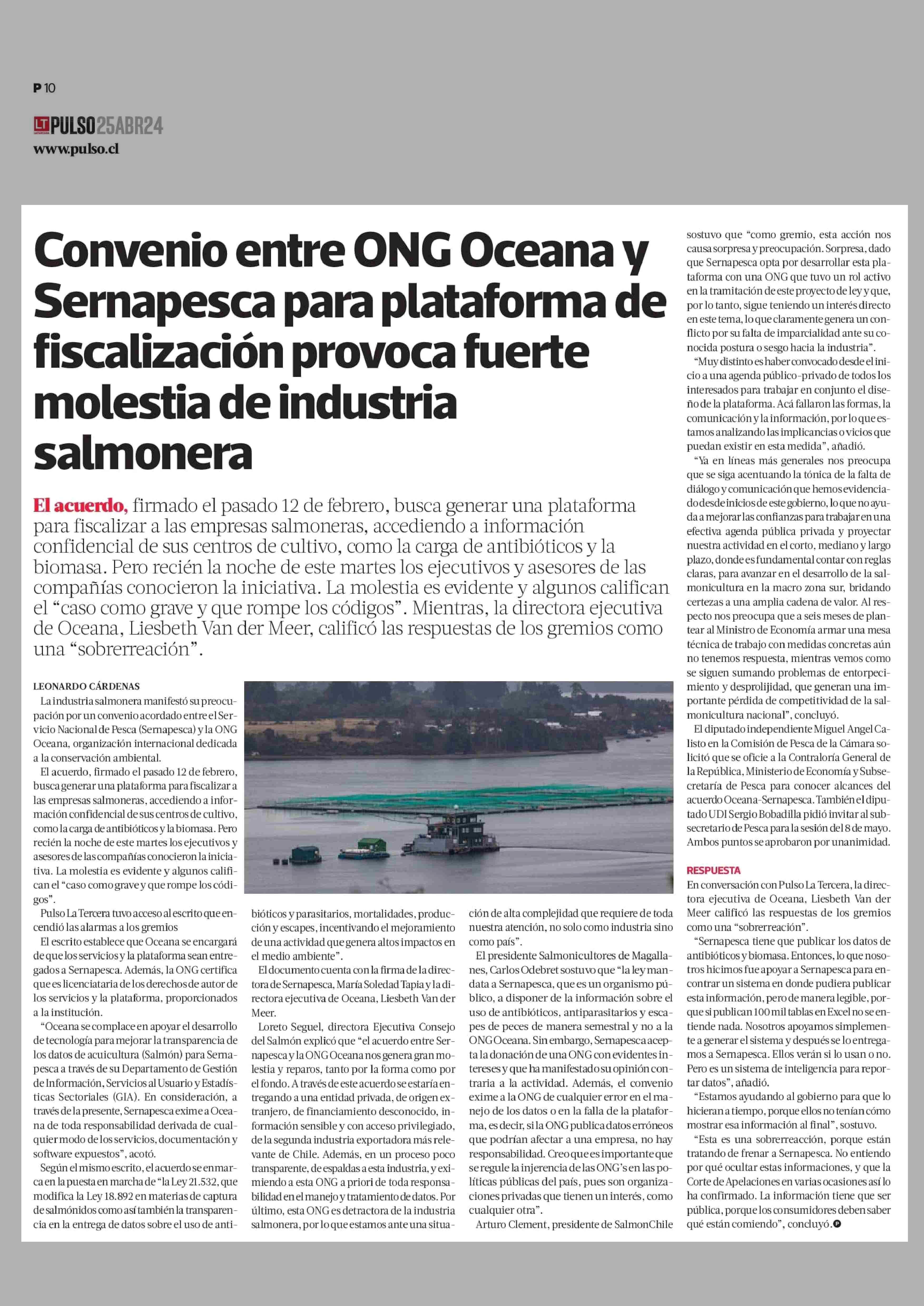 Convenio entre ONG Oceana y Sernapesca para plataforma de fiscalización provoca fuerte molestia de industria salmonera 25-04-2024 La Tercera |