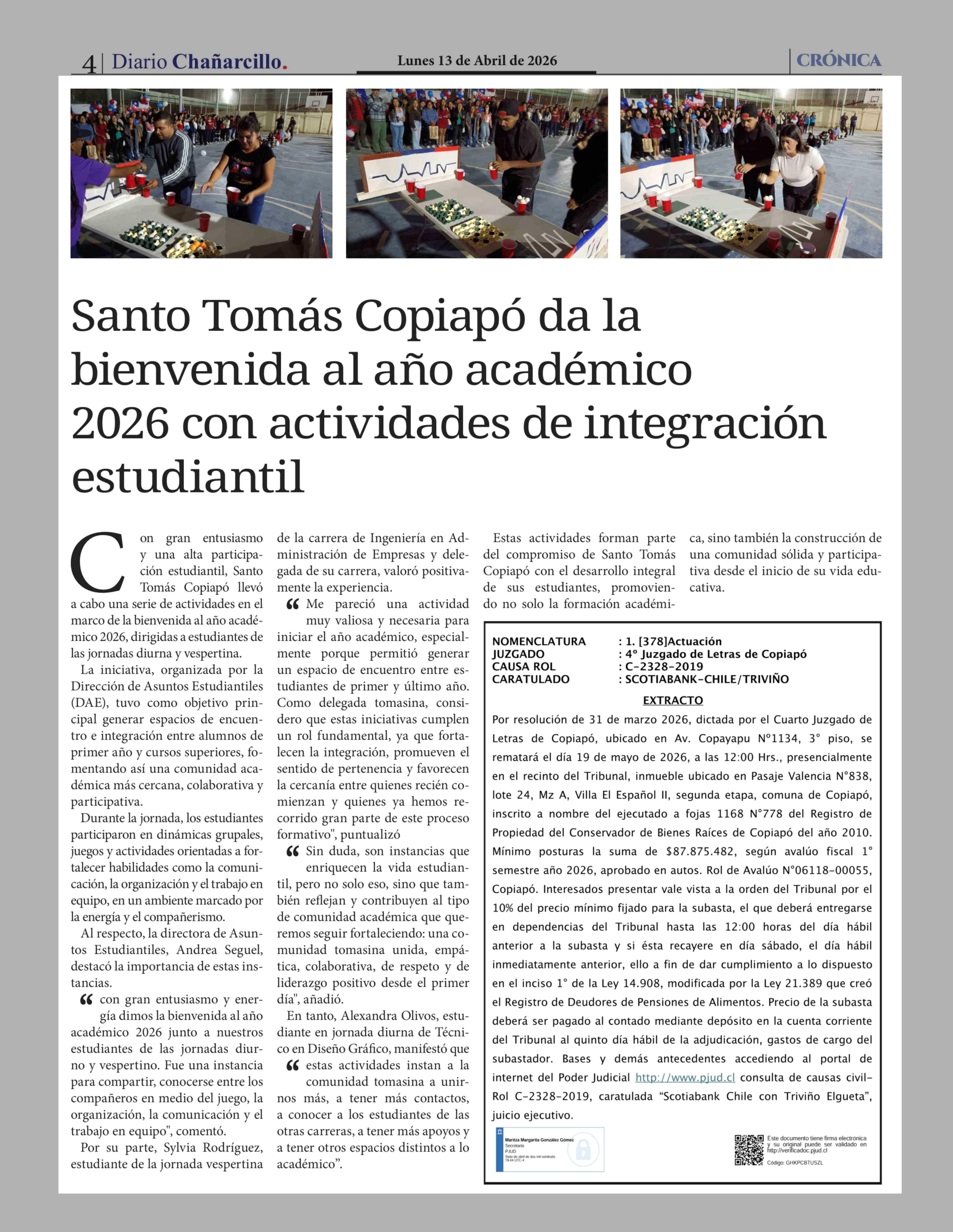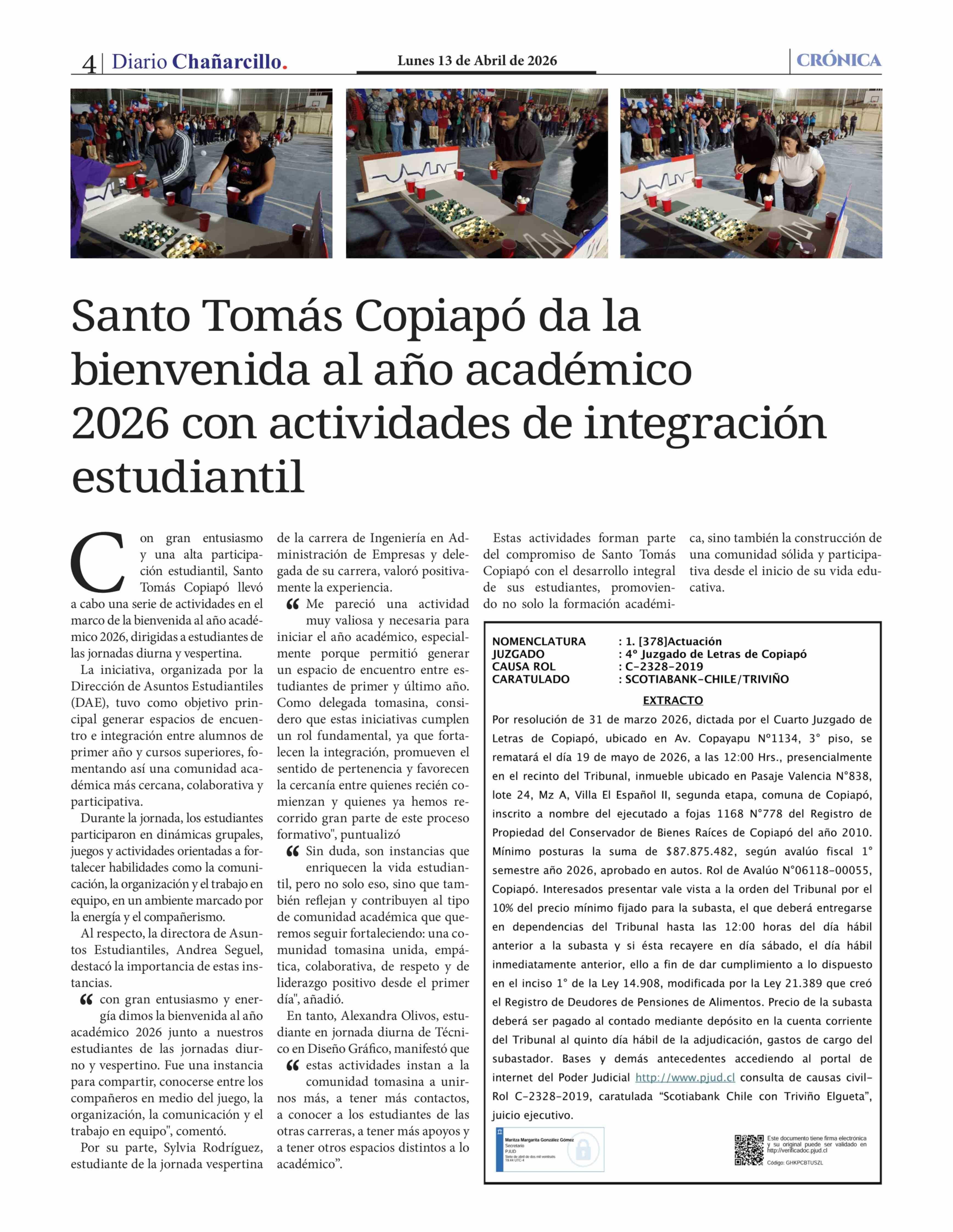 Santo Tomás Copiapó da la bienvenida al año académico 2026 con actividades de integración estudiantil 13-04-2026 Diario Chañarcillo |
