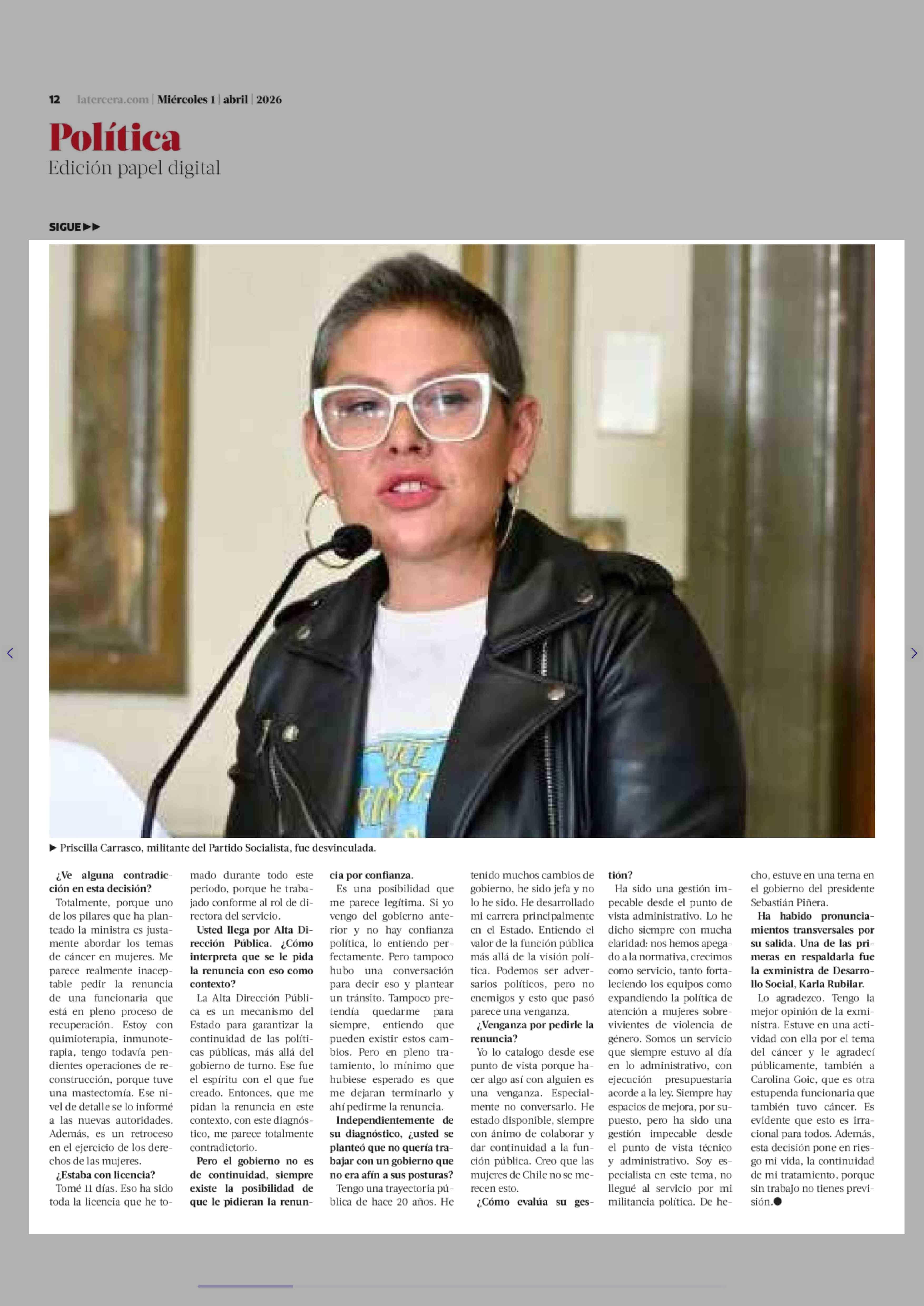 Título: Directora removida de SernamEG: “Lo mínimo que hubiese esperado es que me dejaran terminar el tratamiento antes de pedir mi renuncia”