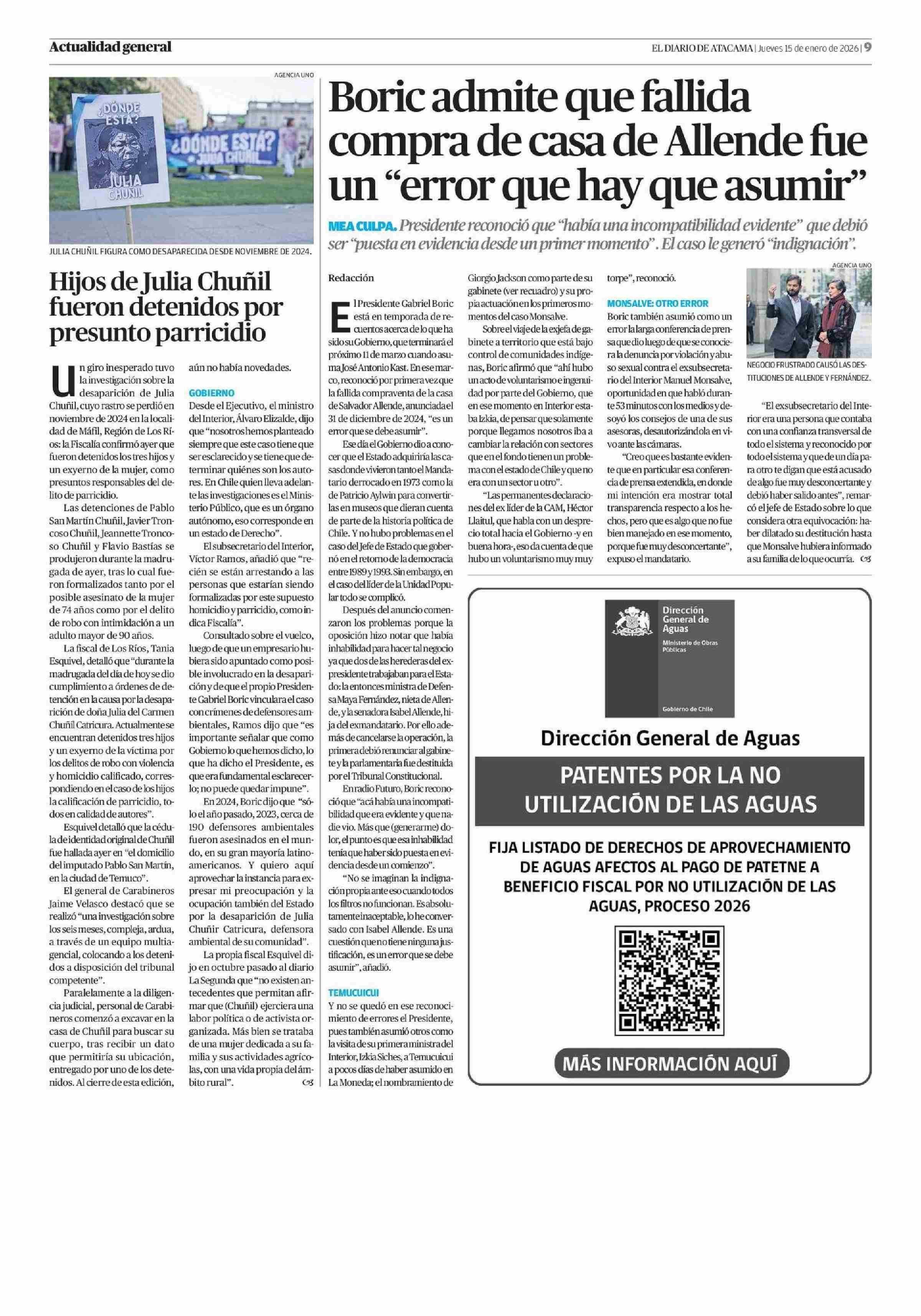 Boric admite que fallida compra de casa de Allende fue un "error que hay que asumir" 15-01-2026 El Diario de Atacama |