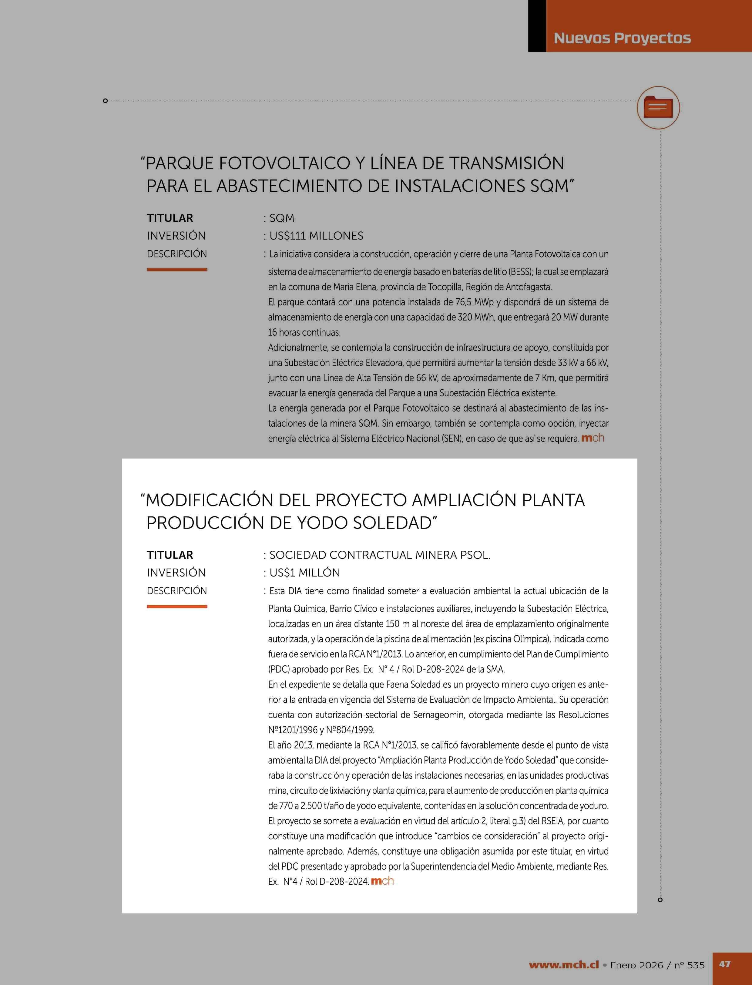 “MODIFICACIÓN DEL PROYECTO AMPLIACIÓN PLANTA PRODUCCIÓN DE YODO SOLEDAD” 23-01-2026 Revista Minería Chilena |