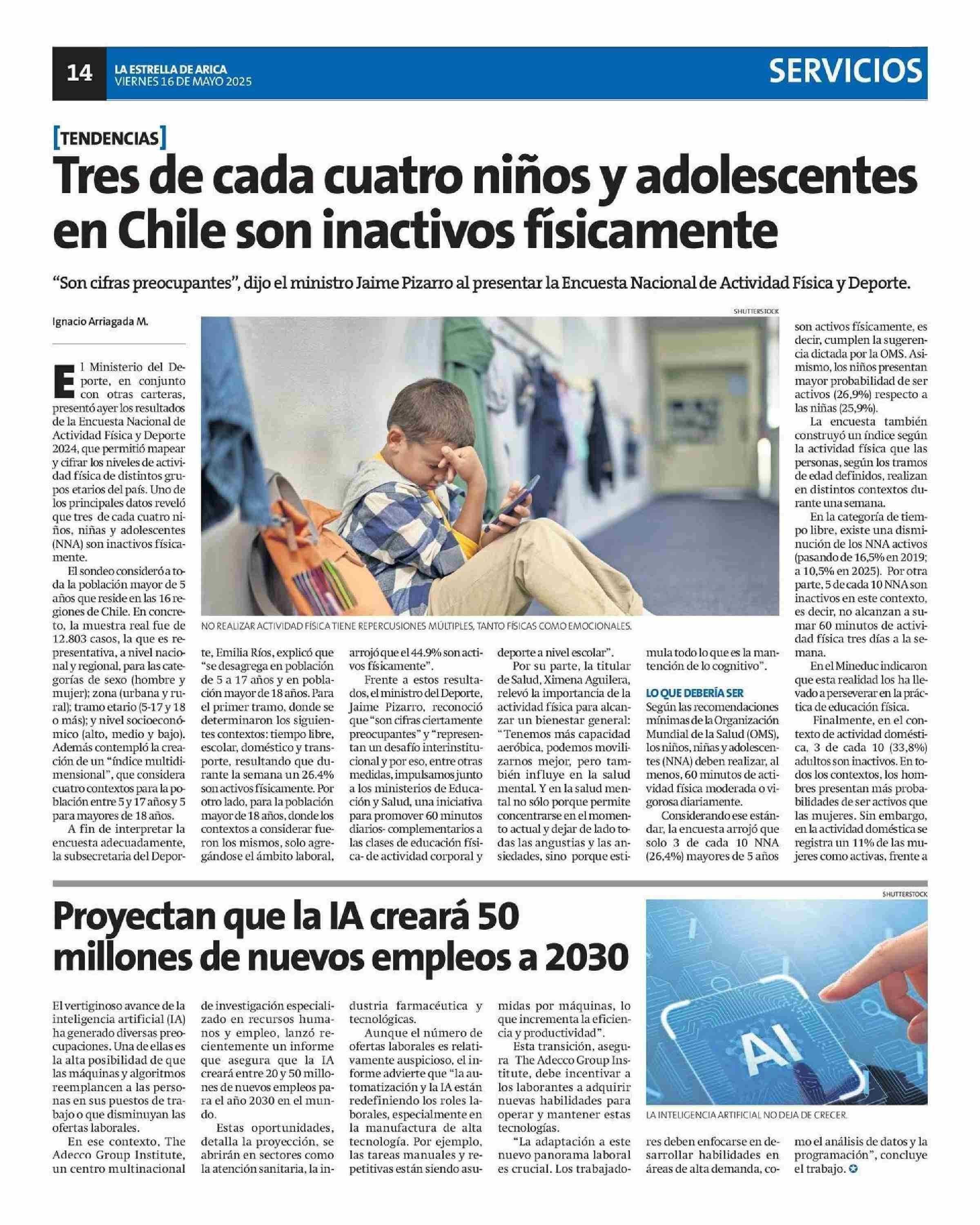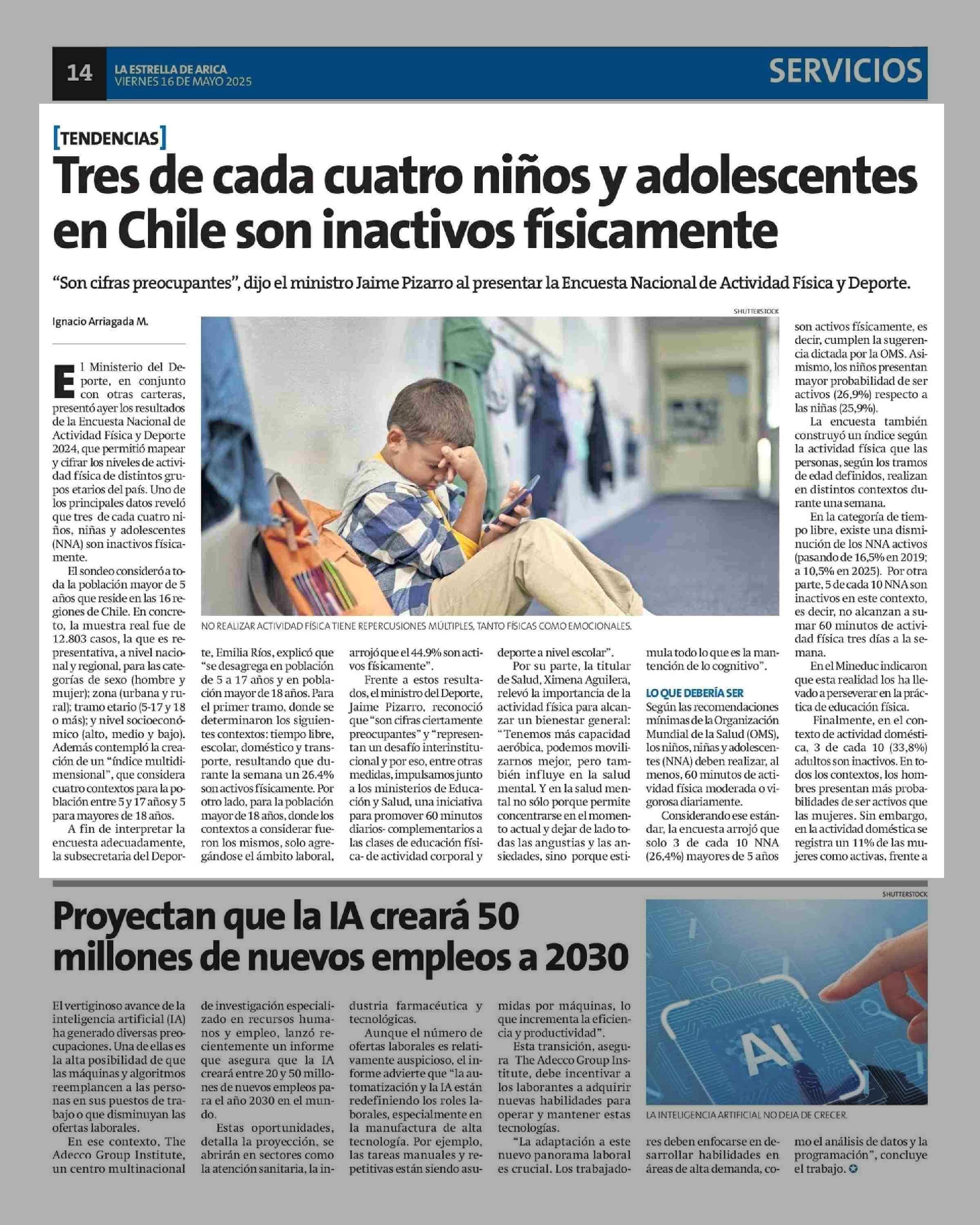 Tres de cada cuatro niños y adolescentes en Chile son inactivos fisicamente 16-05-2025 La Estrella de Arica |