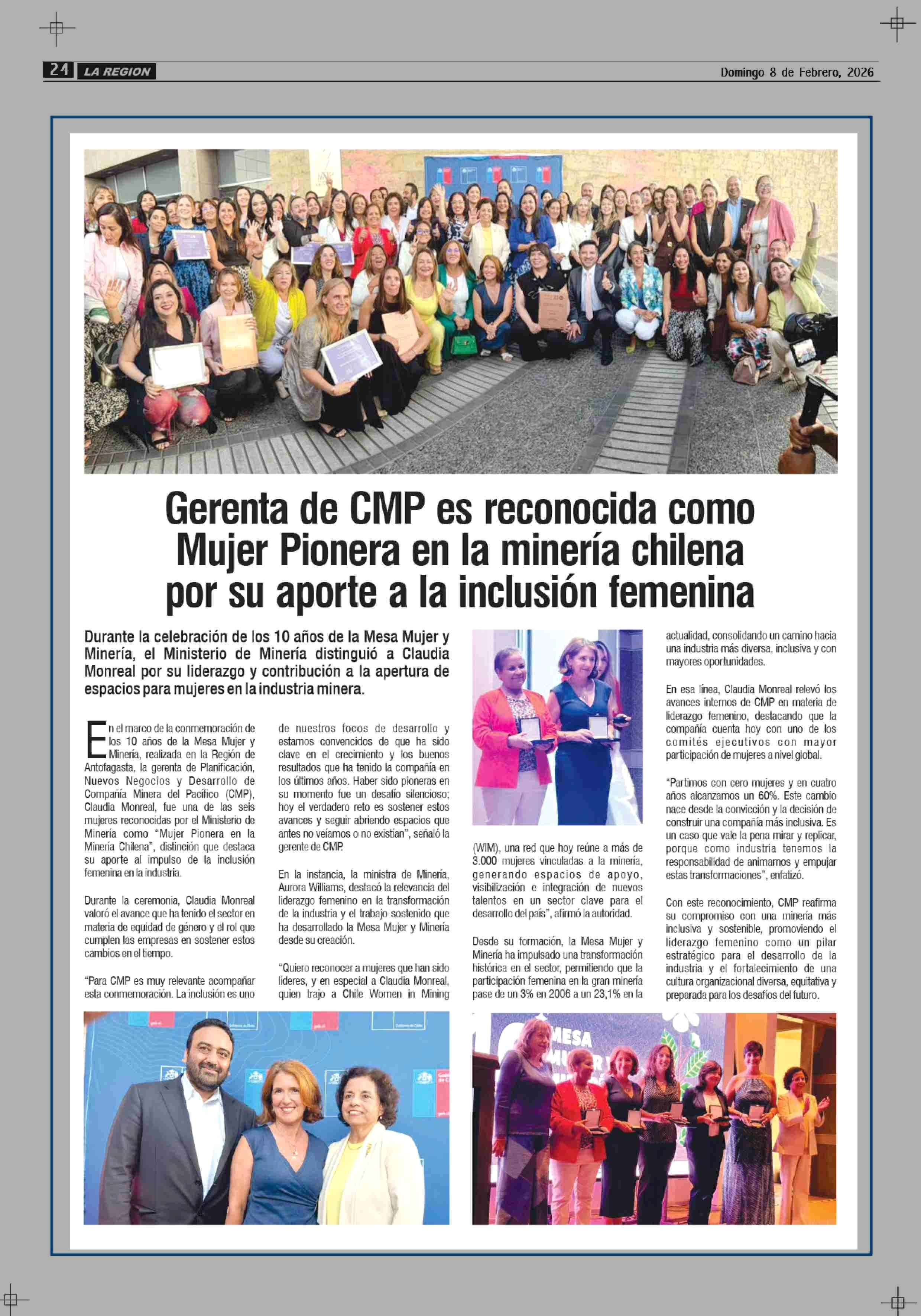 Gerenta de CMP es reconocida como Mujer Pionera en la minería chilena por su aporte a la inclusión femenina 08-02-2026 Diario la Región |