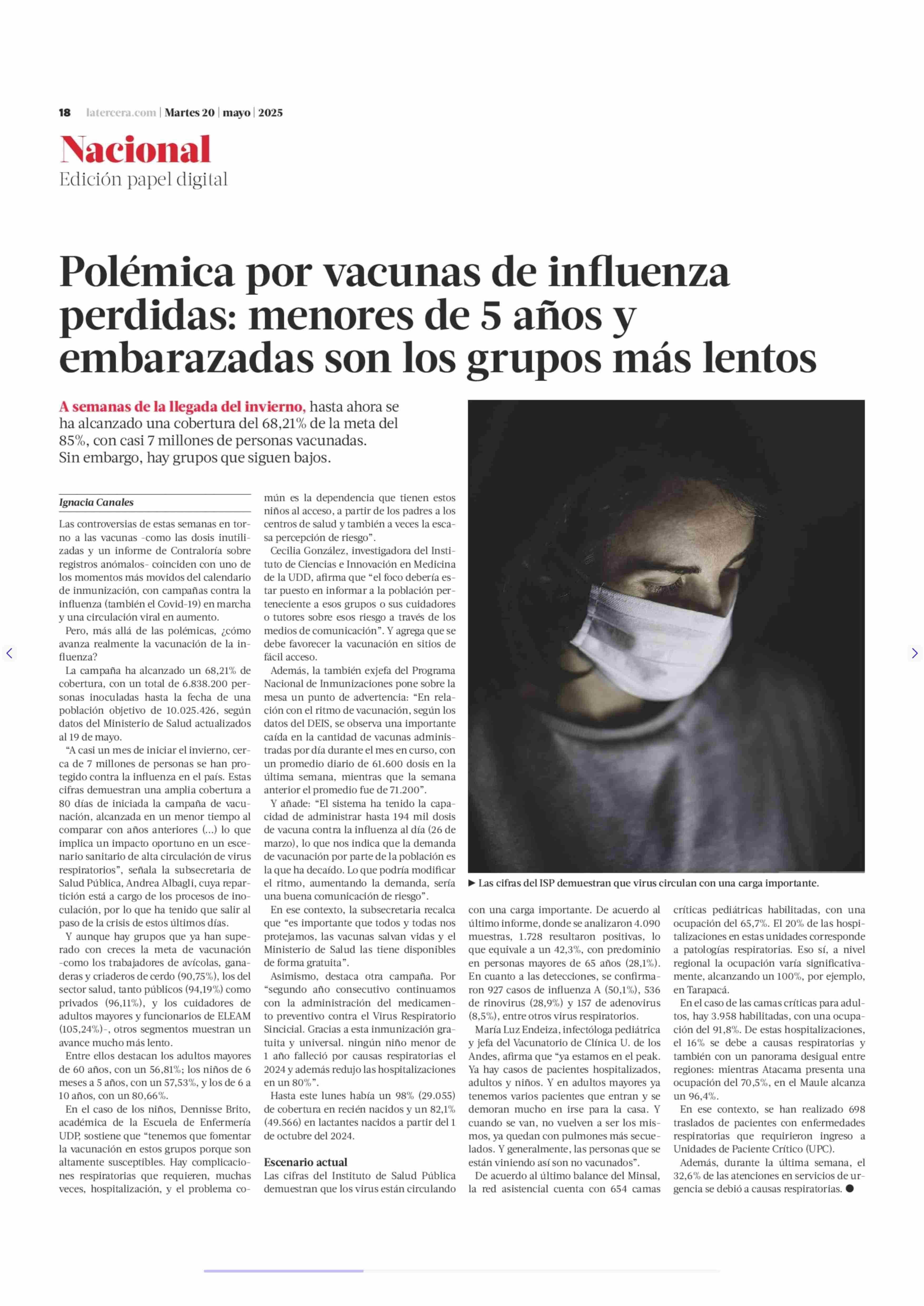 Por vacunas de influenza perdidas: menores de 5 años y embarazadas son los grupos más lentos Polémica 20-05-2025 La Tercera |