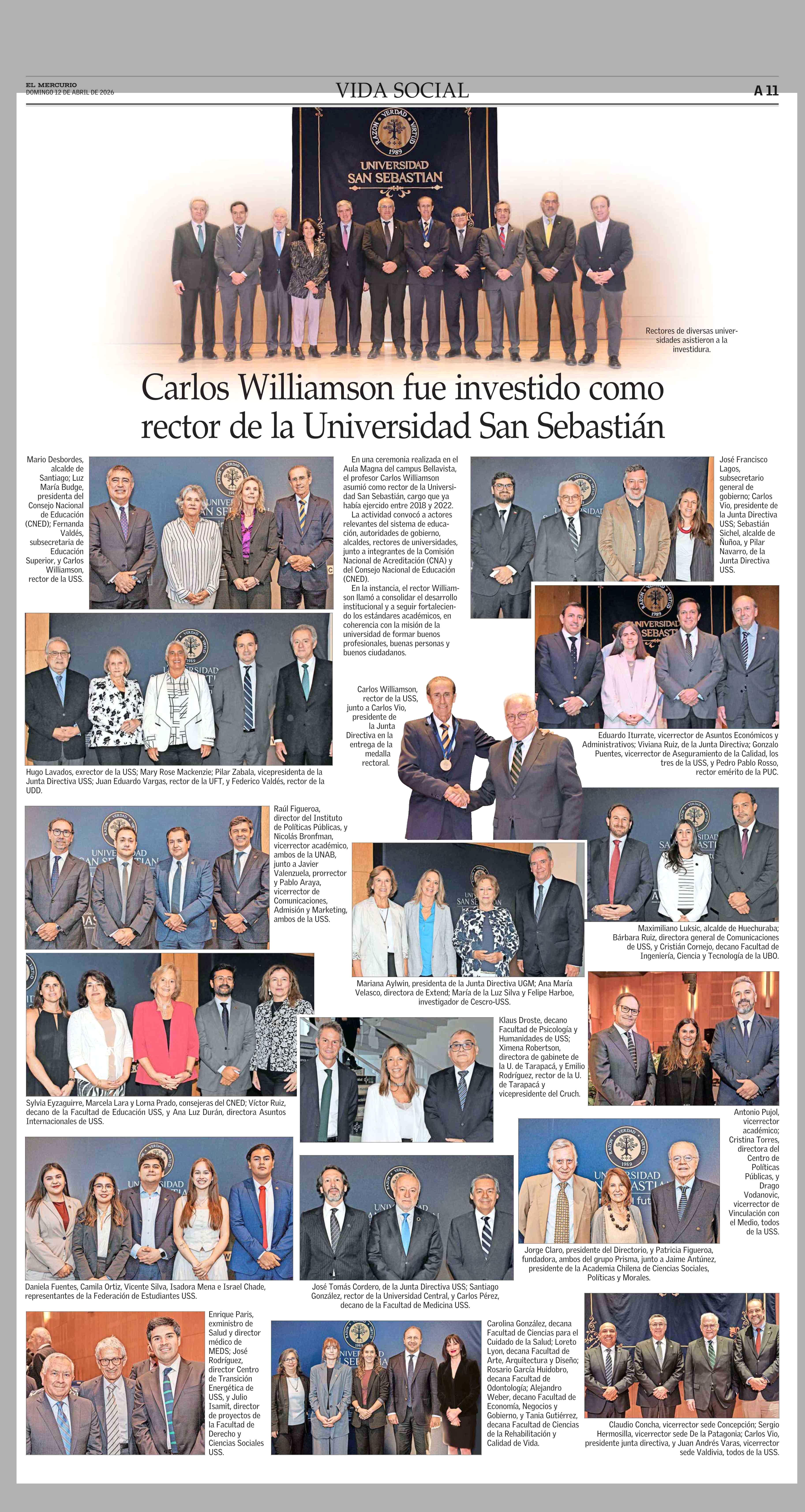 Carlos Williamson fue investido como rector de la Universidad San Sebastián 12-04-2026 El Mercurio |