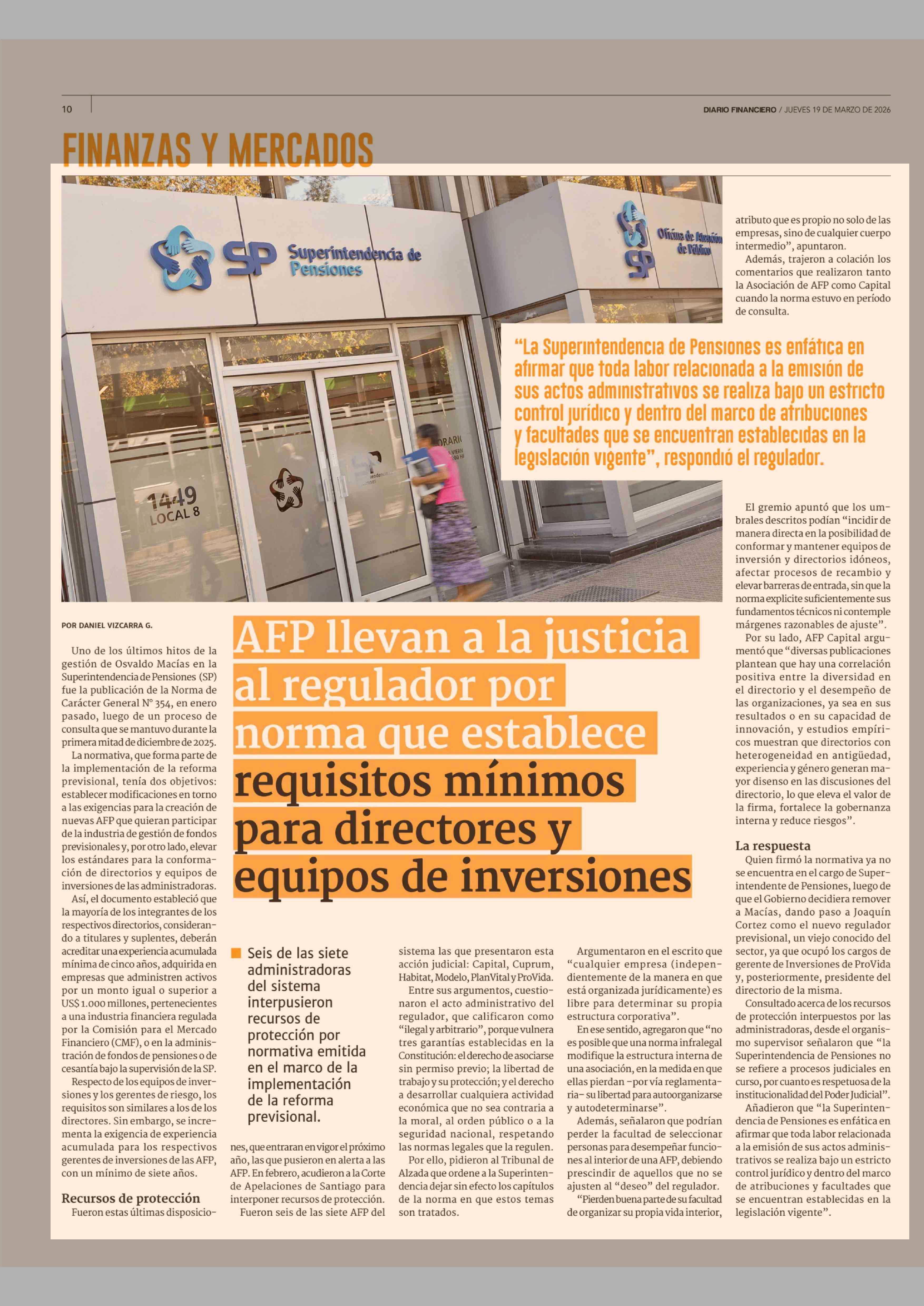 AFP llevan a la justicia al regulador por norma que establece requisitos mínimos para directores y equipos de inversiones 19-03-2026 Diario Financiero |