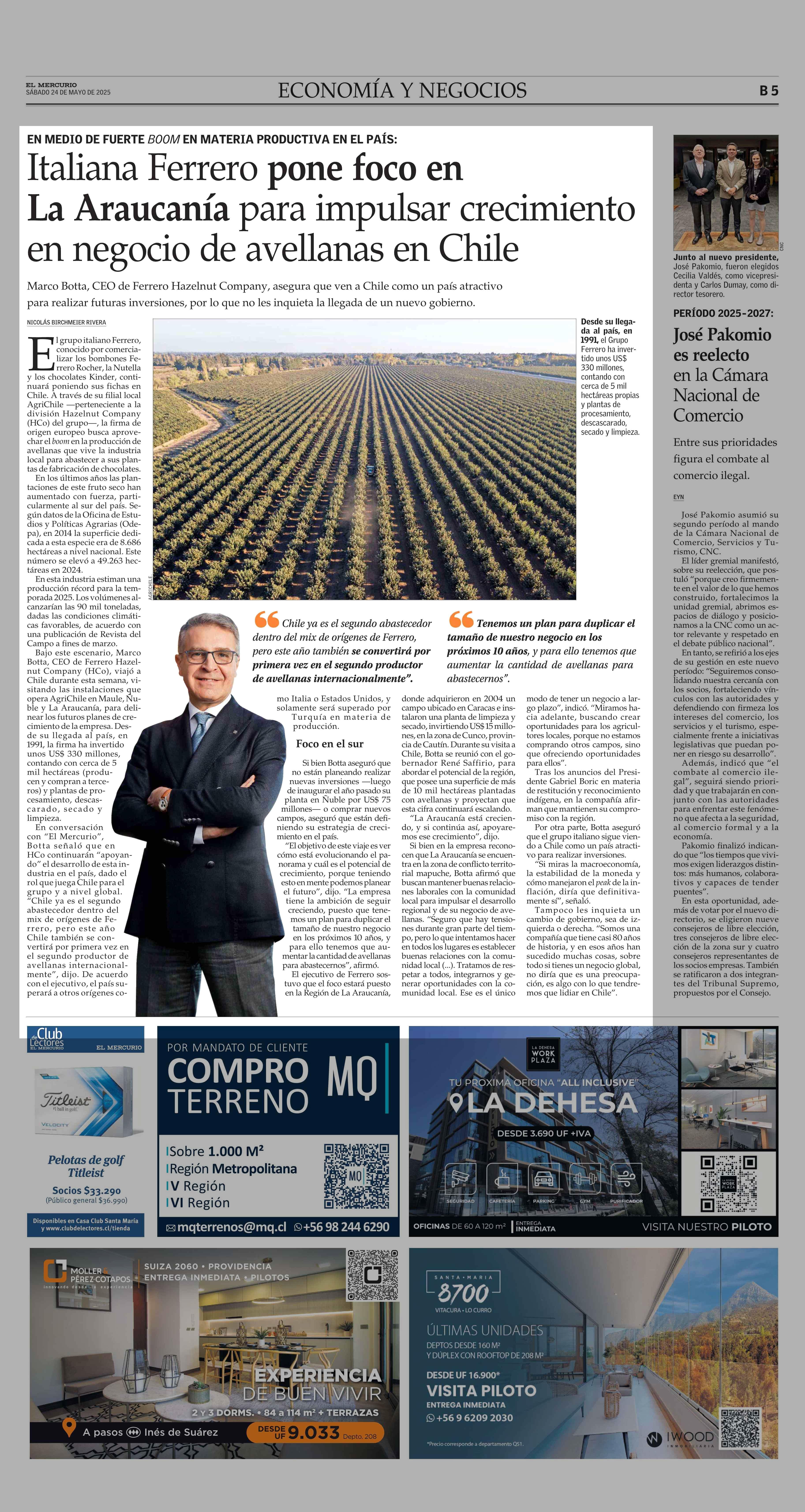 Italiana Ferrero pone foco en La Araucanía para impulsar crecimiento en negocio de avellanas en Chile 24-05-2025 El Mercurio |