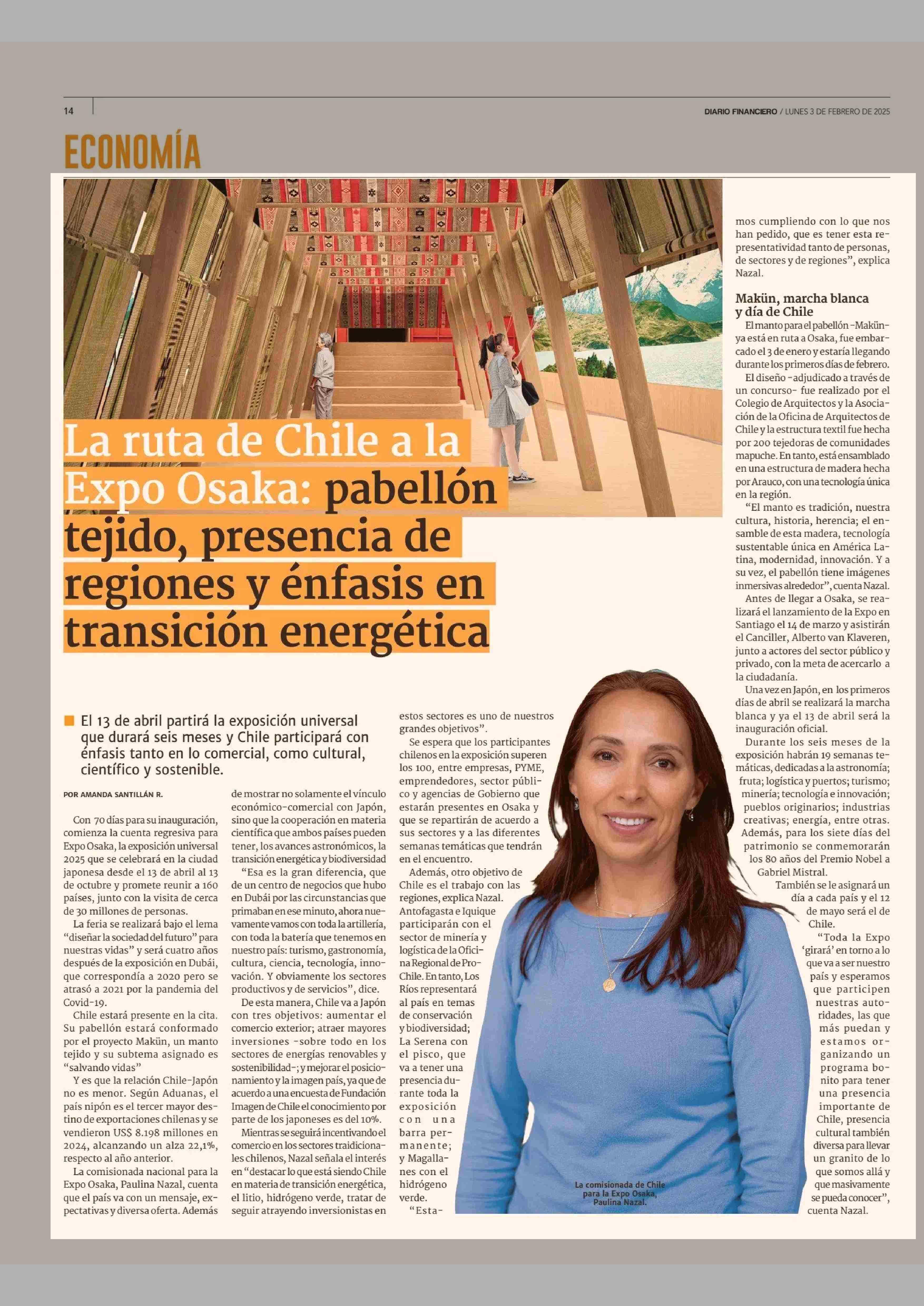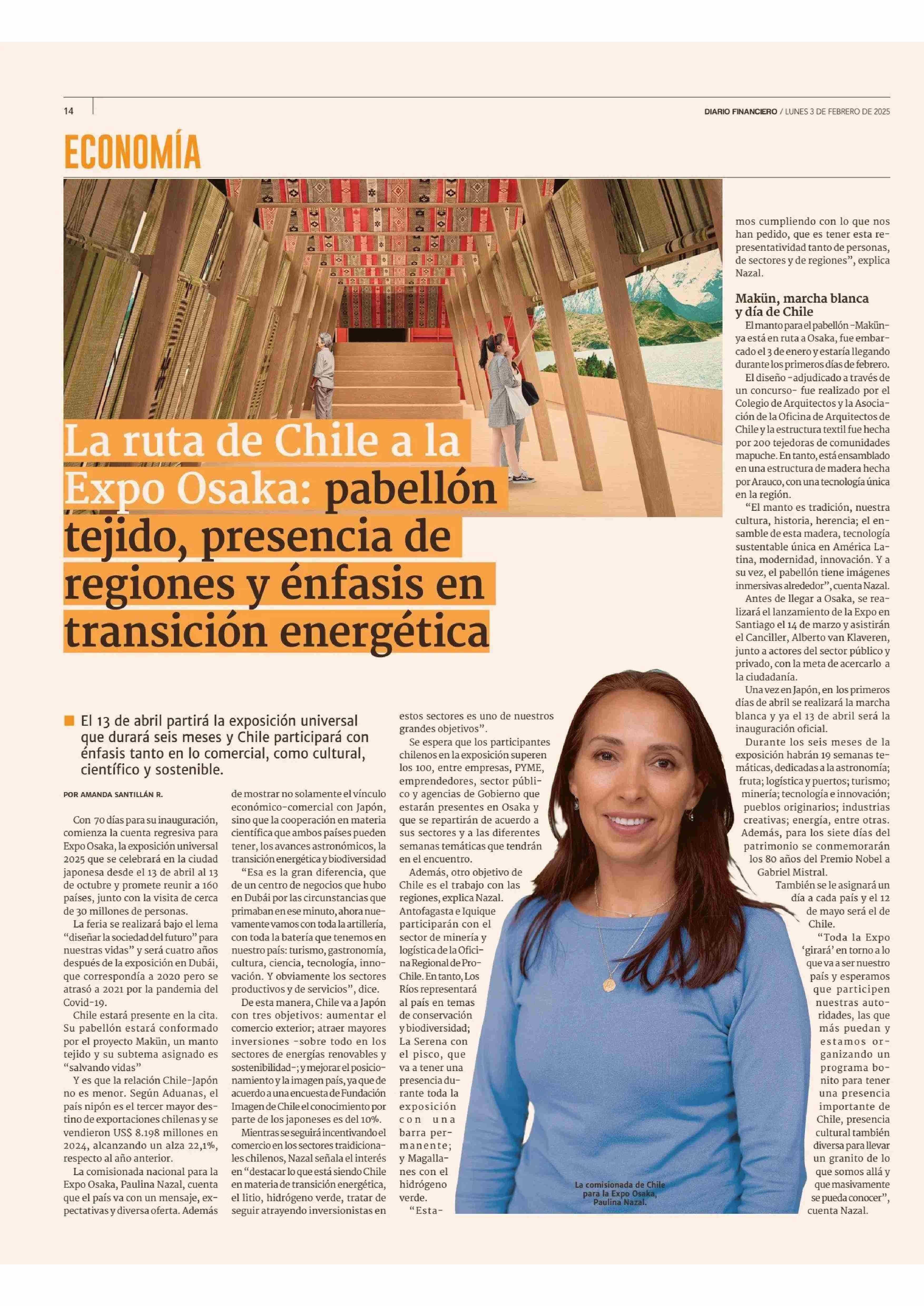 La ruta de Chile a la Expo Osaka: pabellón tejido, presencia de regiones y énfasis en transición energética 03-02-2025 Diario Financiero |