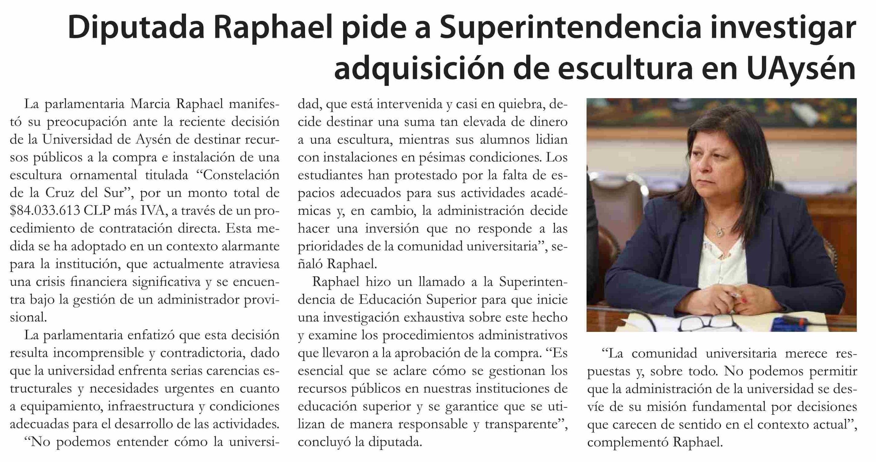 Título: Diputada Raphael pide a Superintendencia investigar adquisición de escultura en UAysén