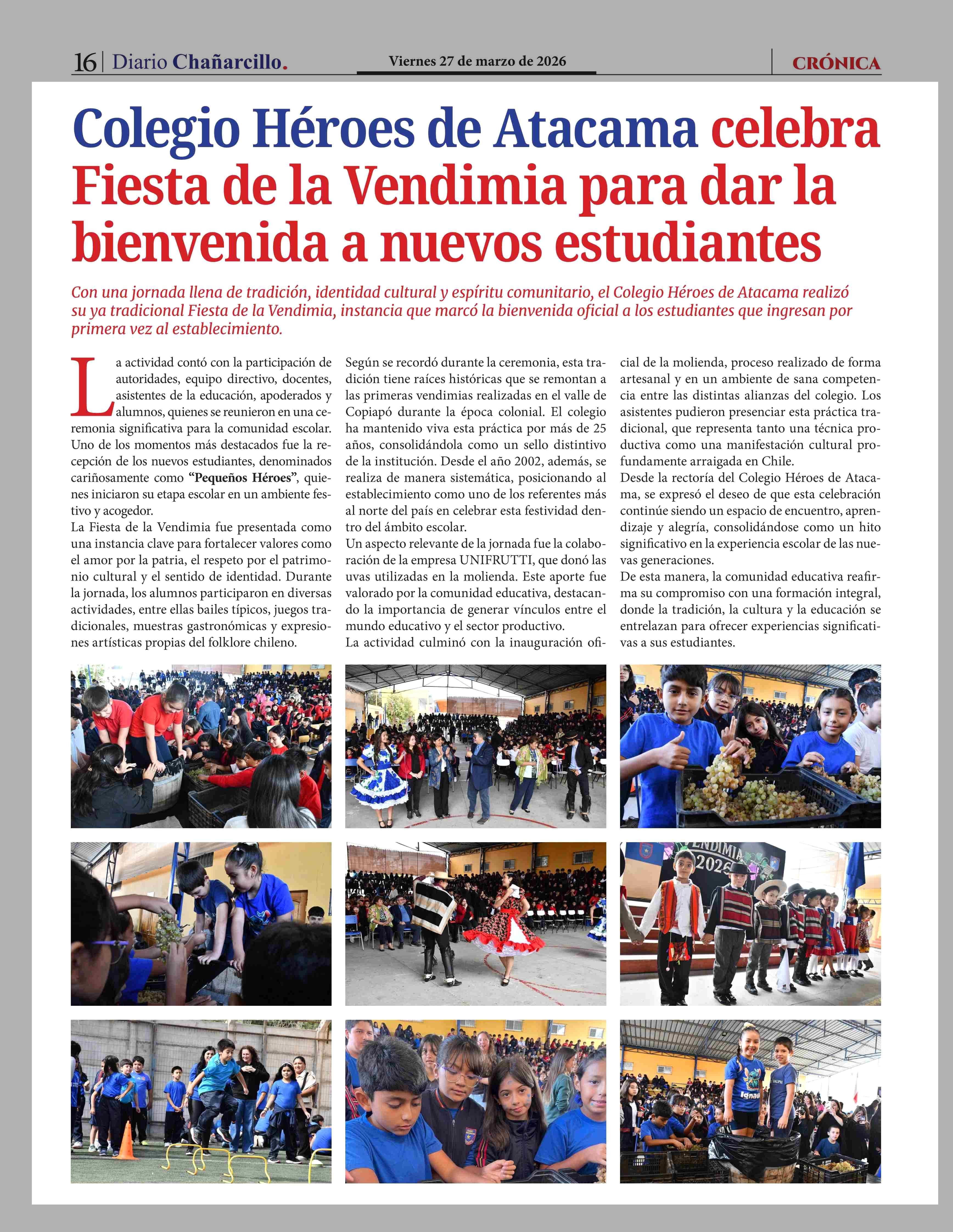 Colegio Héroes de Atacama celebra Fiesta de la Vendimia para dar la bienvenida a nuevos estudiantes 27-03-2026 Diario Chañarcillo |