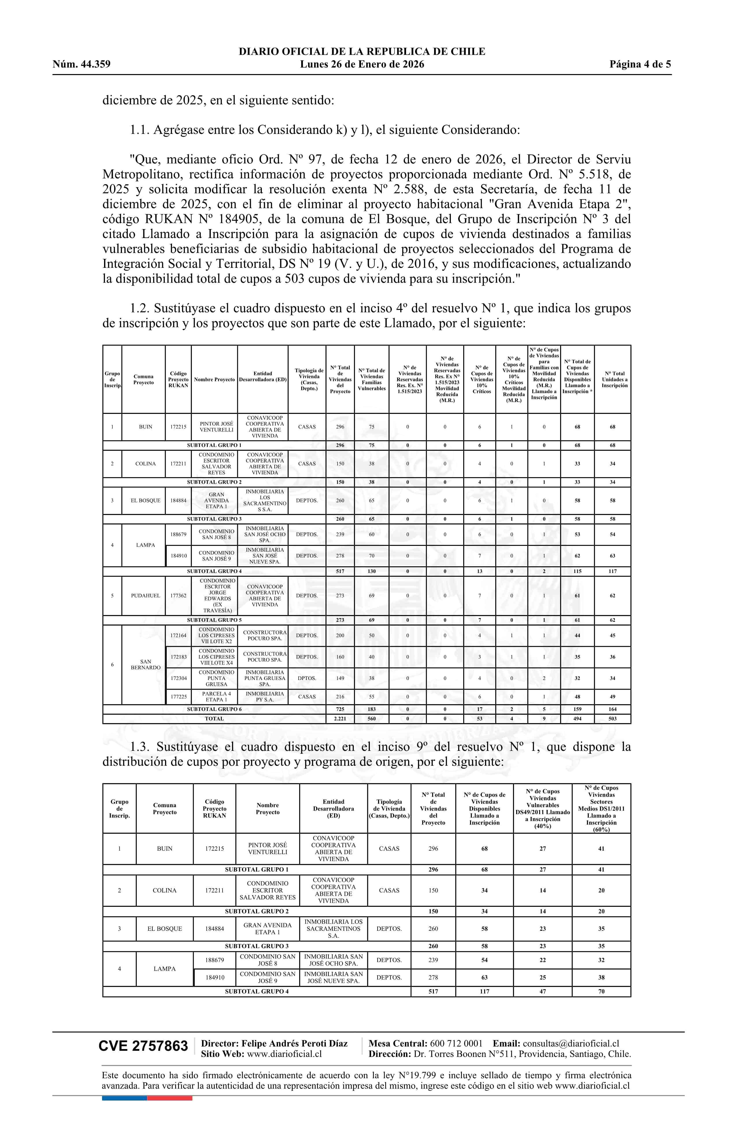 Resolución exenta número 42, de 2026.- Modifica resolución Nº 2.588 exenta, de 2025, que llama a inscripción para la asignación de cupos de vivienda destinados a familias vulnerables beneficiarias de subsidio a los proyectos habitacionales seleccionados Pintor José Venturelli de Buin, Condominio Esc