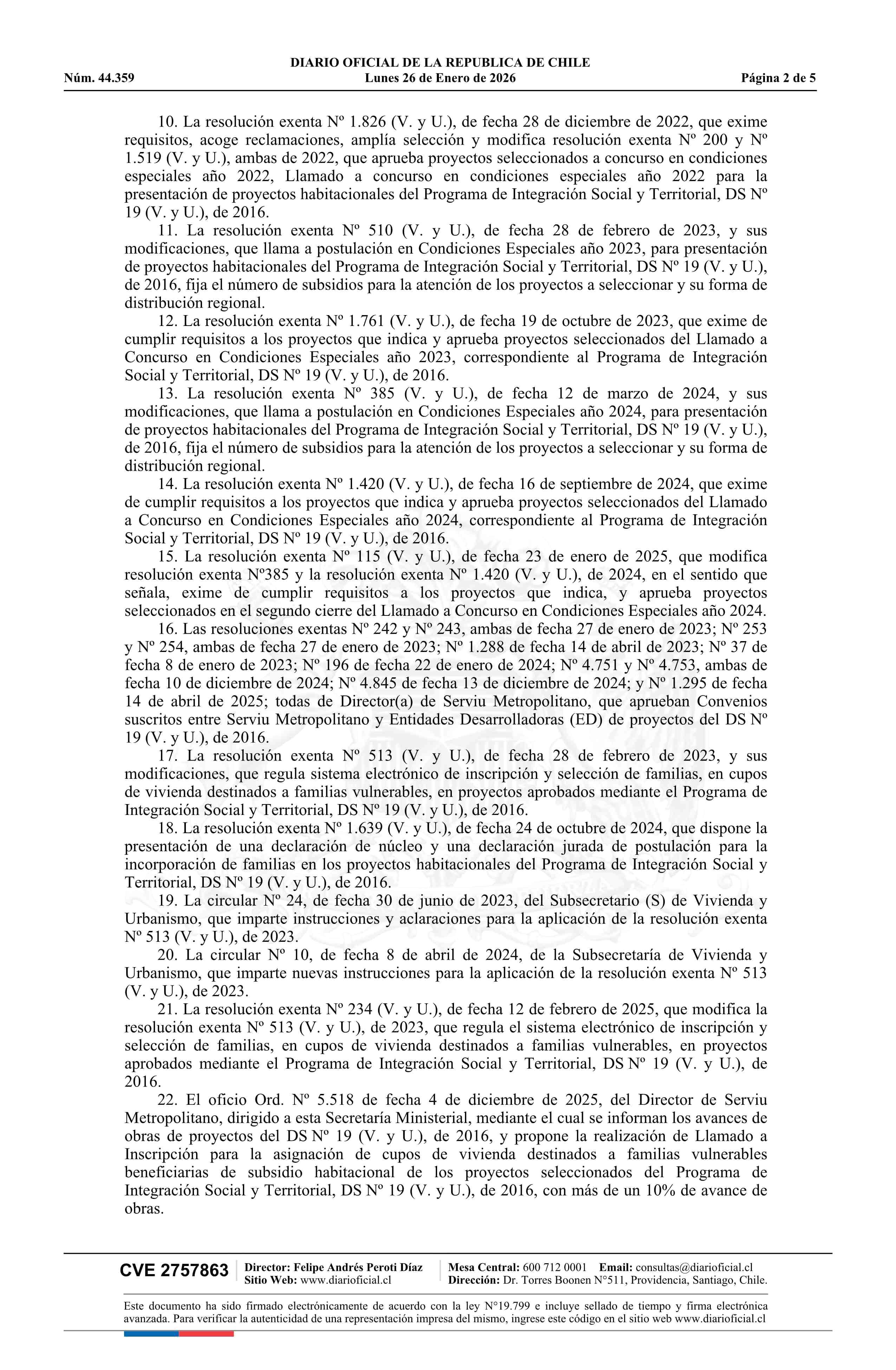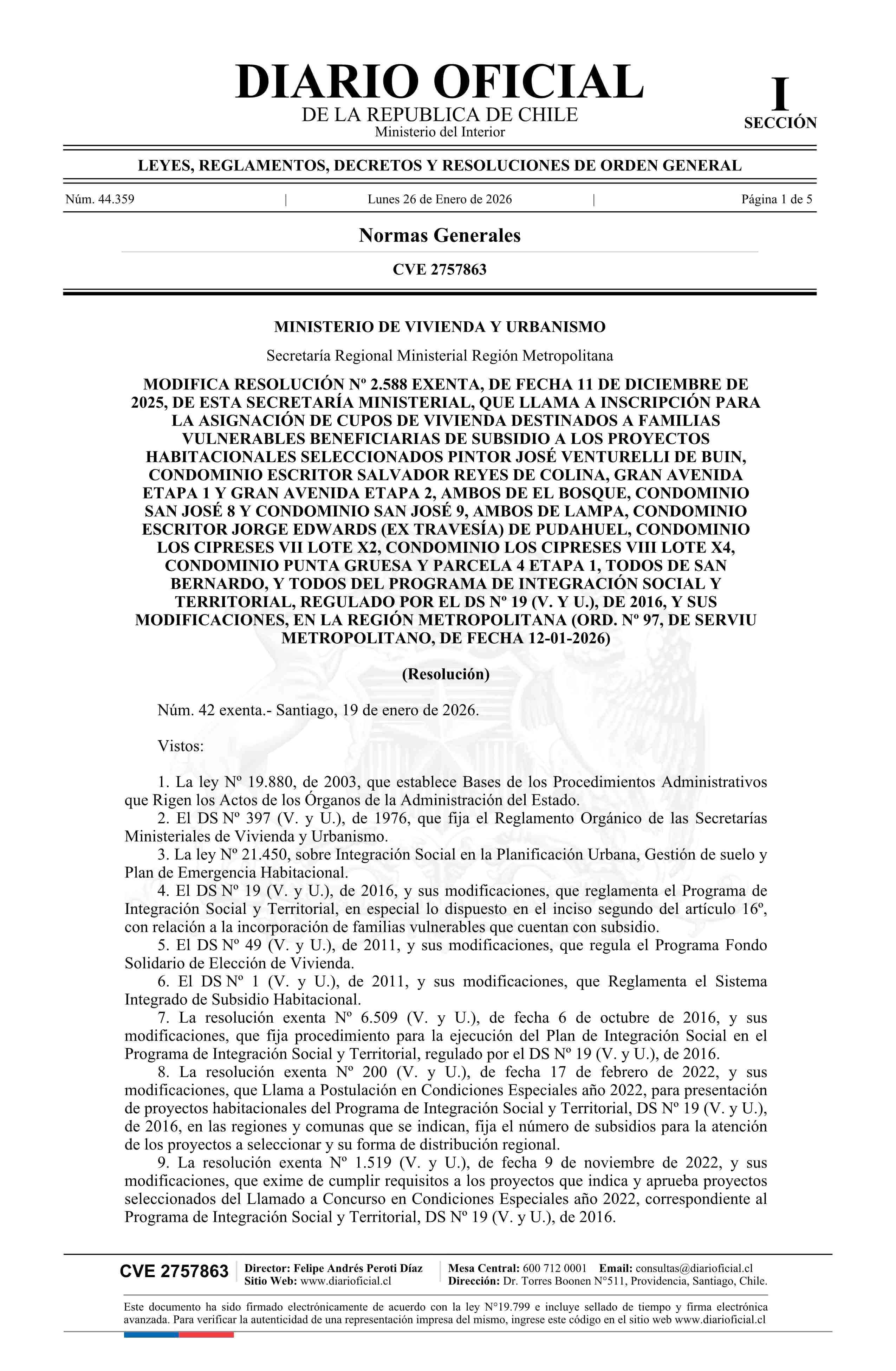 Título: Resolución exenta número 42, de 2026.- Modifica resolución Nº 2.588 exenta, de 2025, que llama a inscripción para la asignación de cupos de vivienda destinados a familias vulnerables beneficiarias de subsidio a los proyectos habitacionales seleccionados Pintor José Venturelli de Buin, Condominio Esc