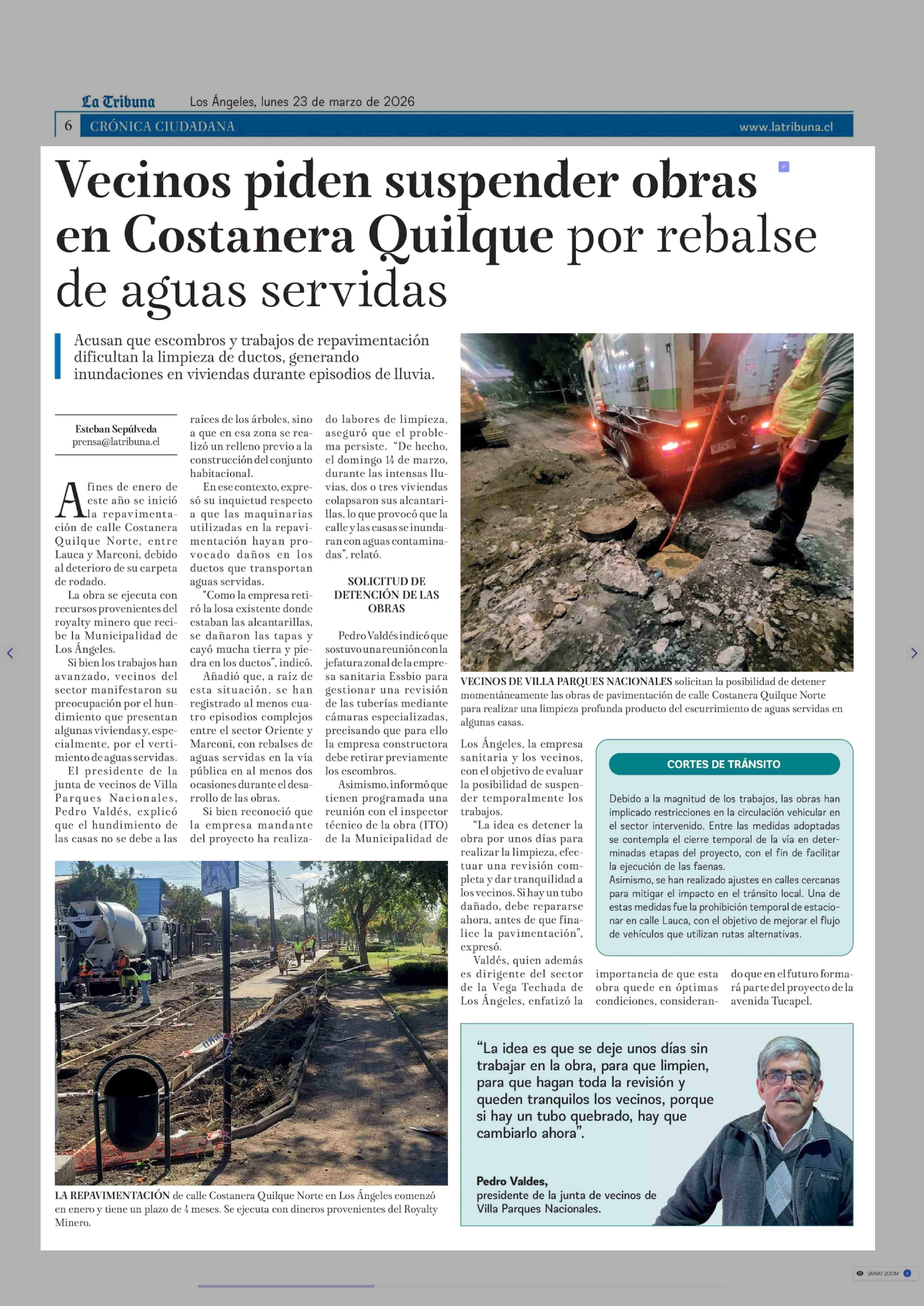Vecinos piden suspender obras en Costanera Quilque por rebalse de aguas servidas 23-03-2026 La Tribuna |