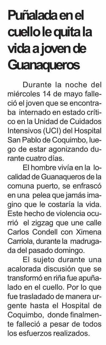 | Título: | Puñalada en el cuello le quita la vida a joven de Guanaqueros |