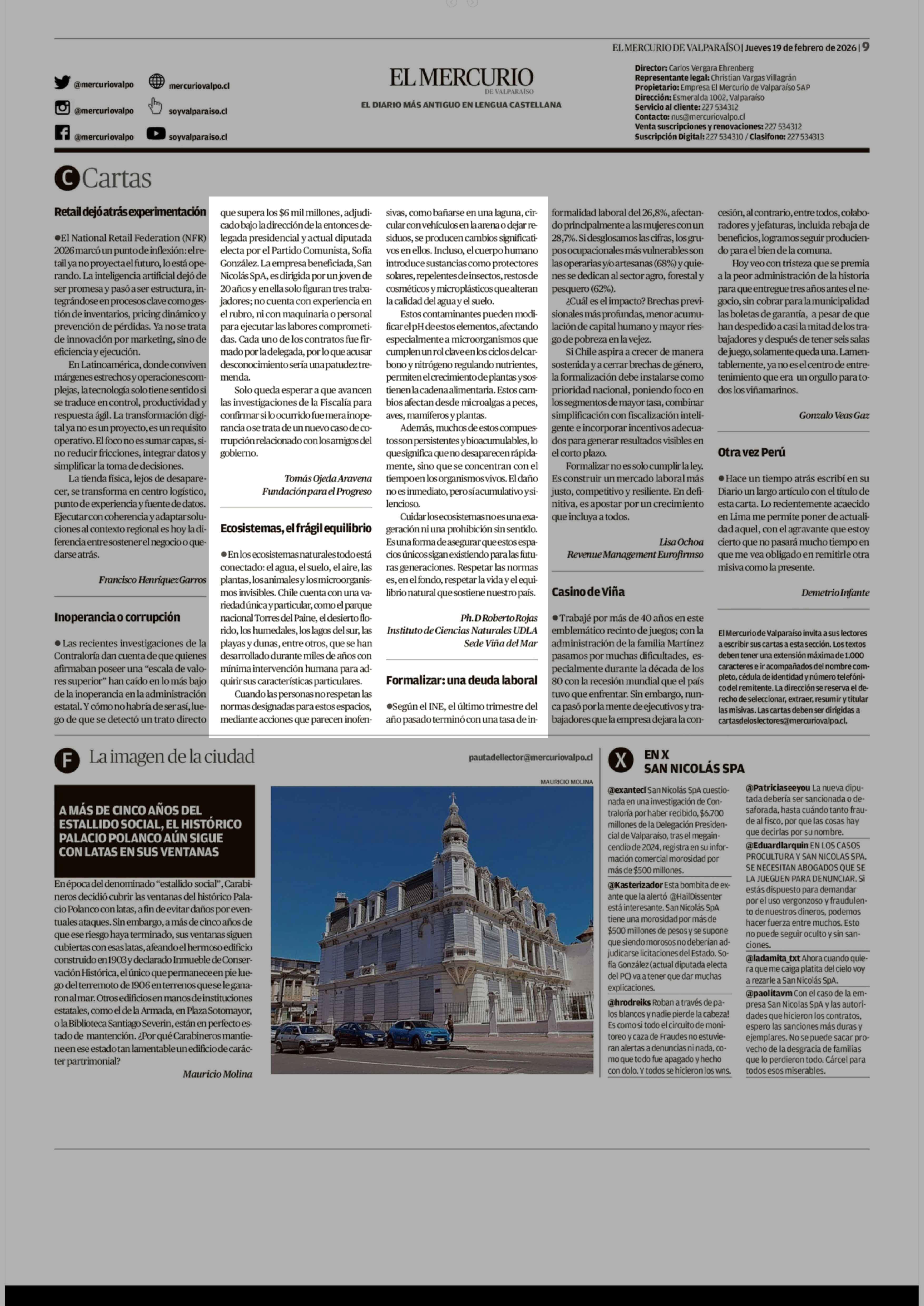 Cartas: Ecosistemas, el frágil equilibrio 19-02-2026 El Mercurio de Valparaíso |