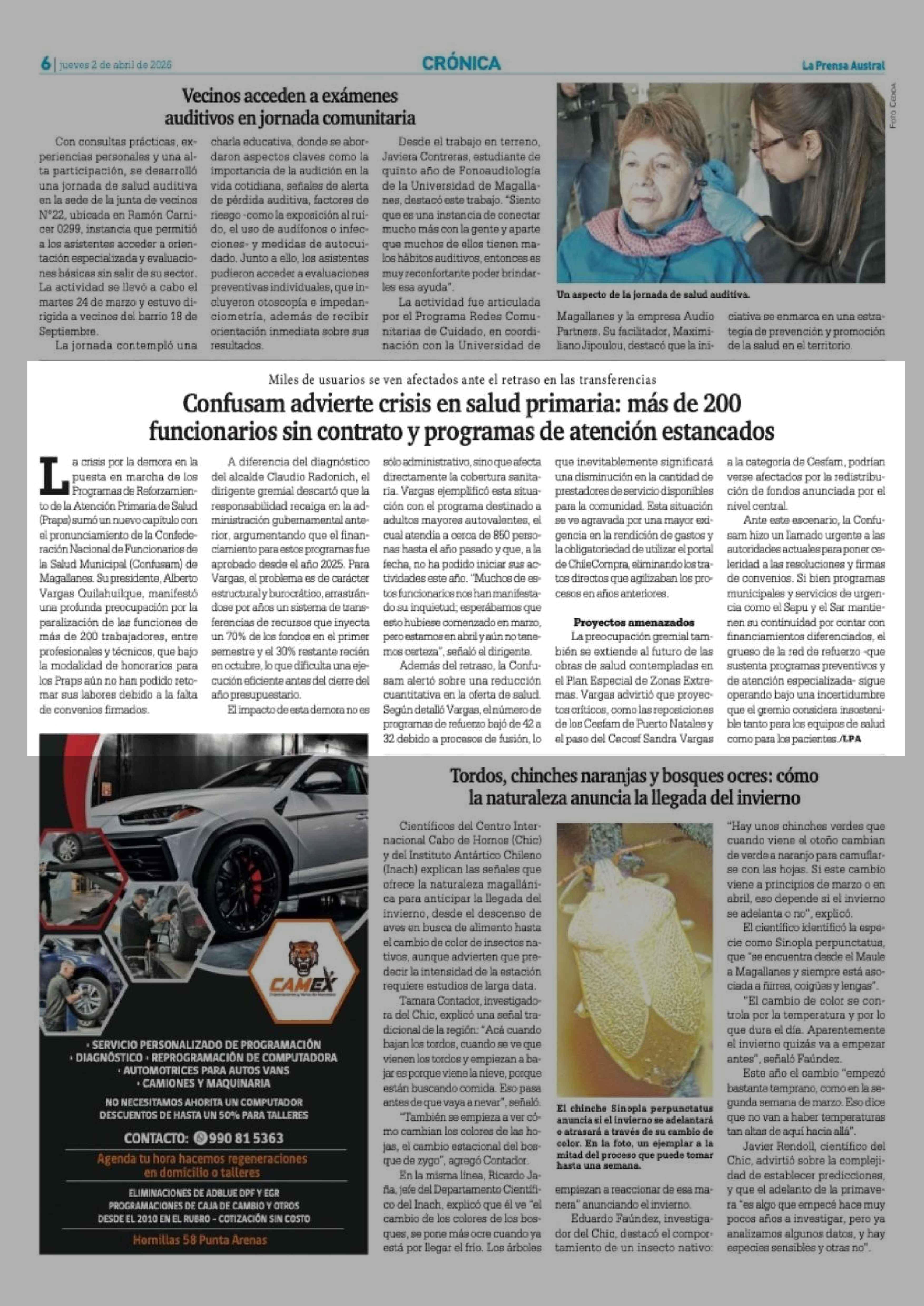 Confusam advierte crisis en salud primaria: más de 200 funcionarios sin contrato y programas de atención estancados 02-04-2026 La Prensa Austral |