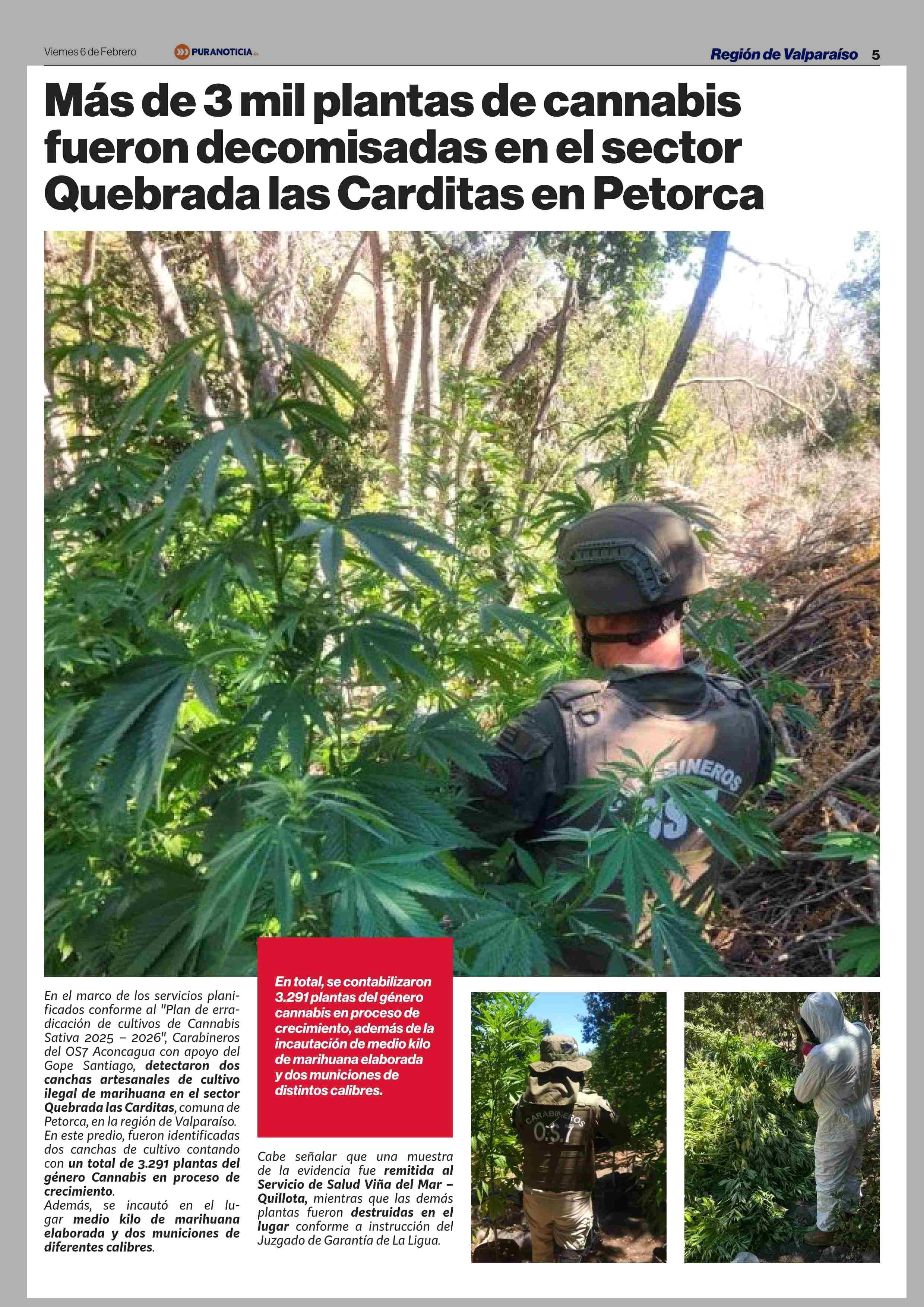 Más de 3 mil plantas de cannabis fueron decomisadas en el sector Quebrada las Carditas en Petorca 06-02-2026 Puranoticia.cl |