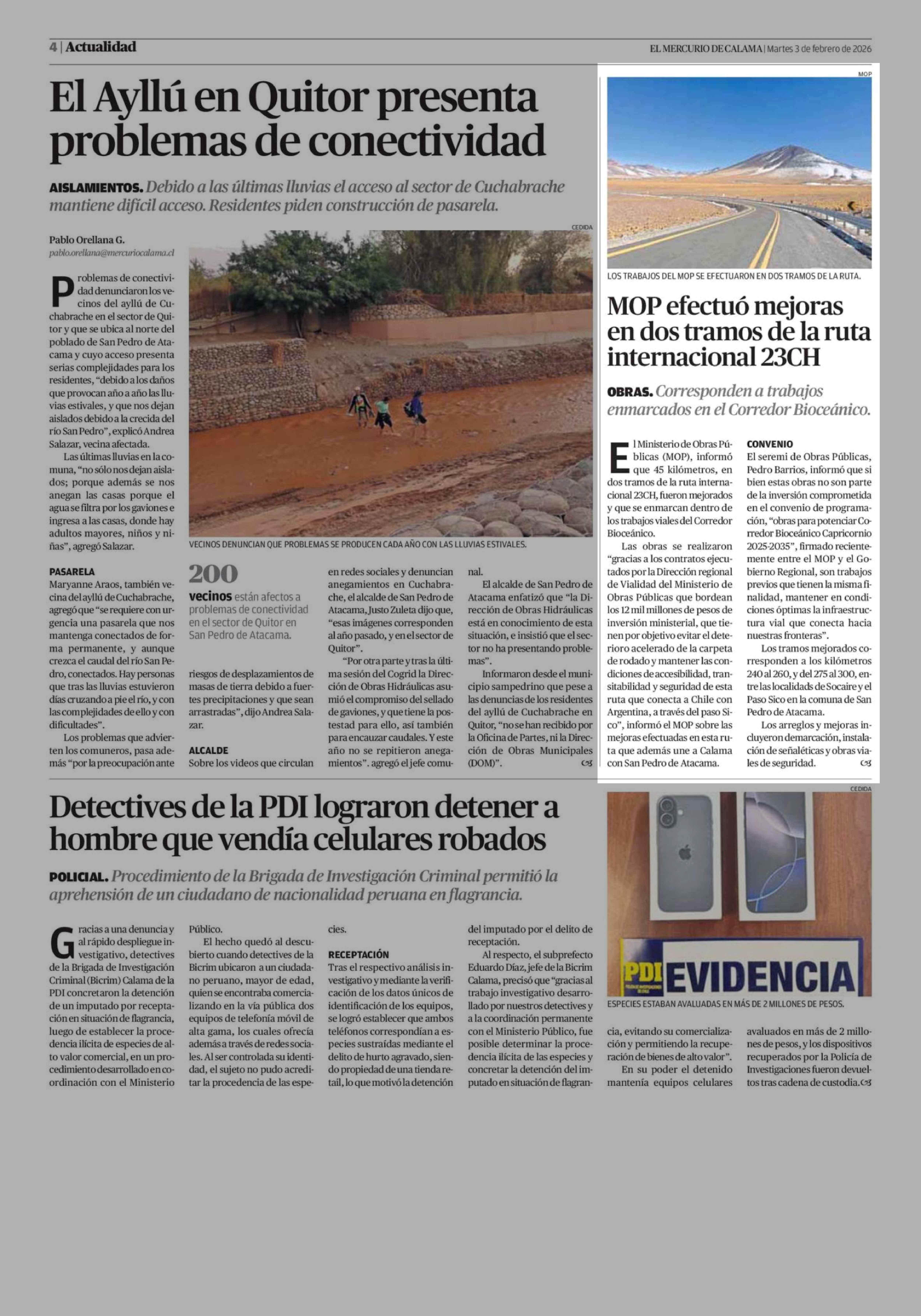 MOP efectuó mejoras en dos tramos de la ruta internacional 23CH 03-02-2026 El Mercurio de Calama |