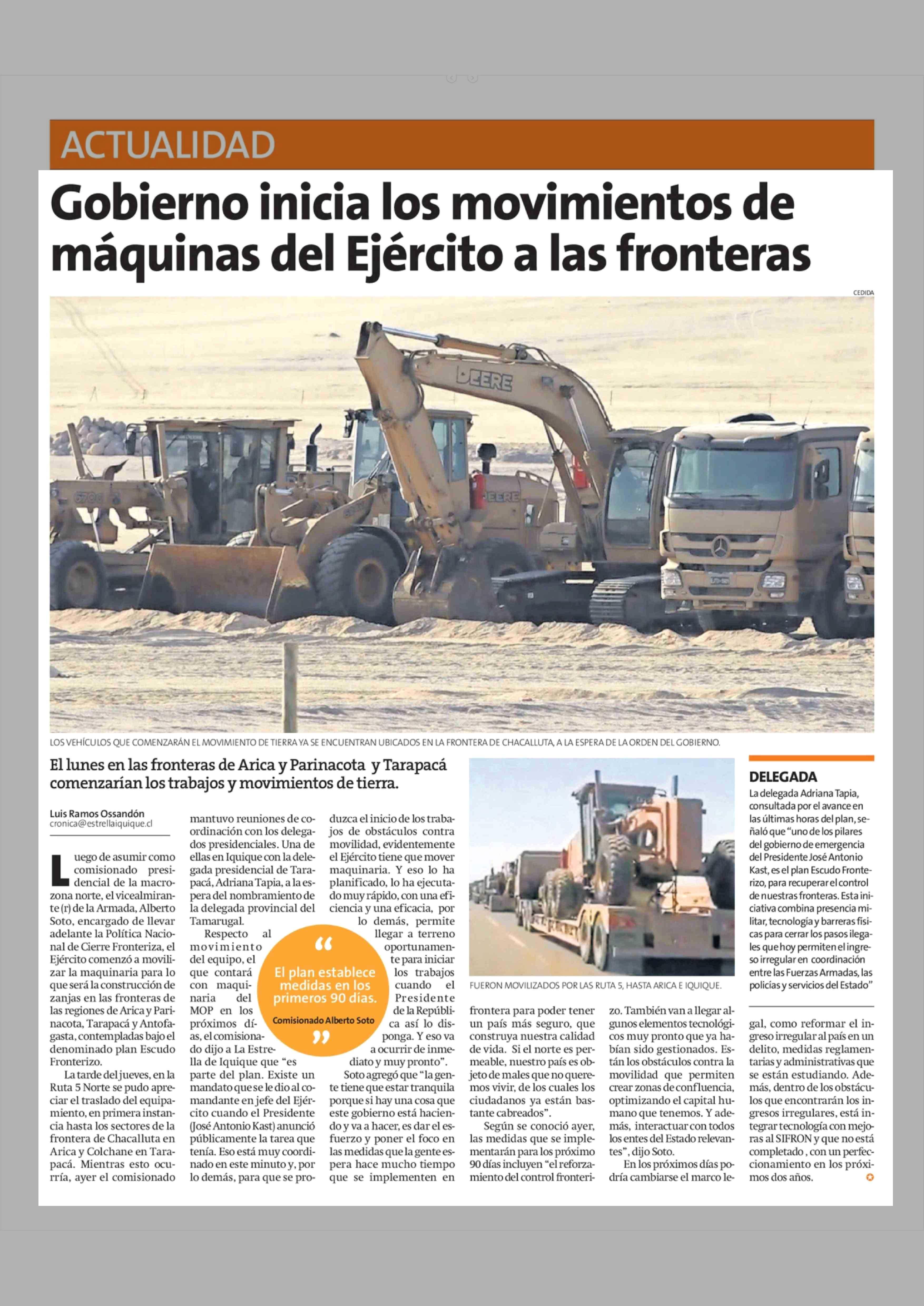 Título: Gobierno inicia los movimientos de máquinas del Ejército a las fronteras
