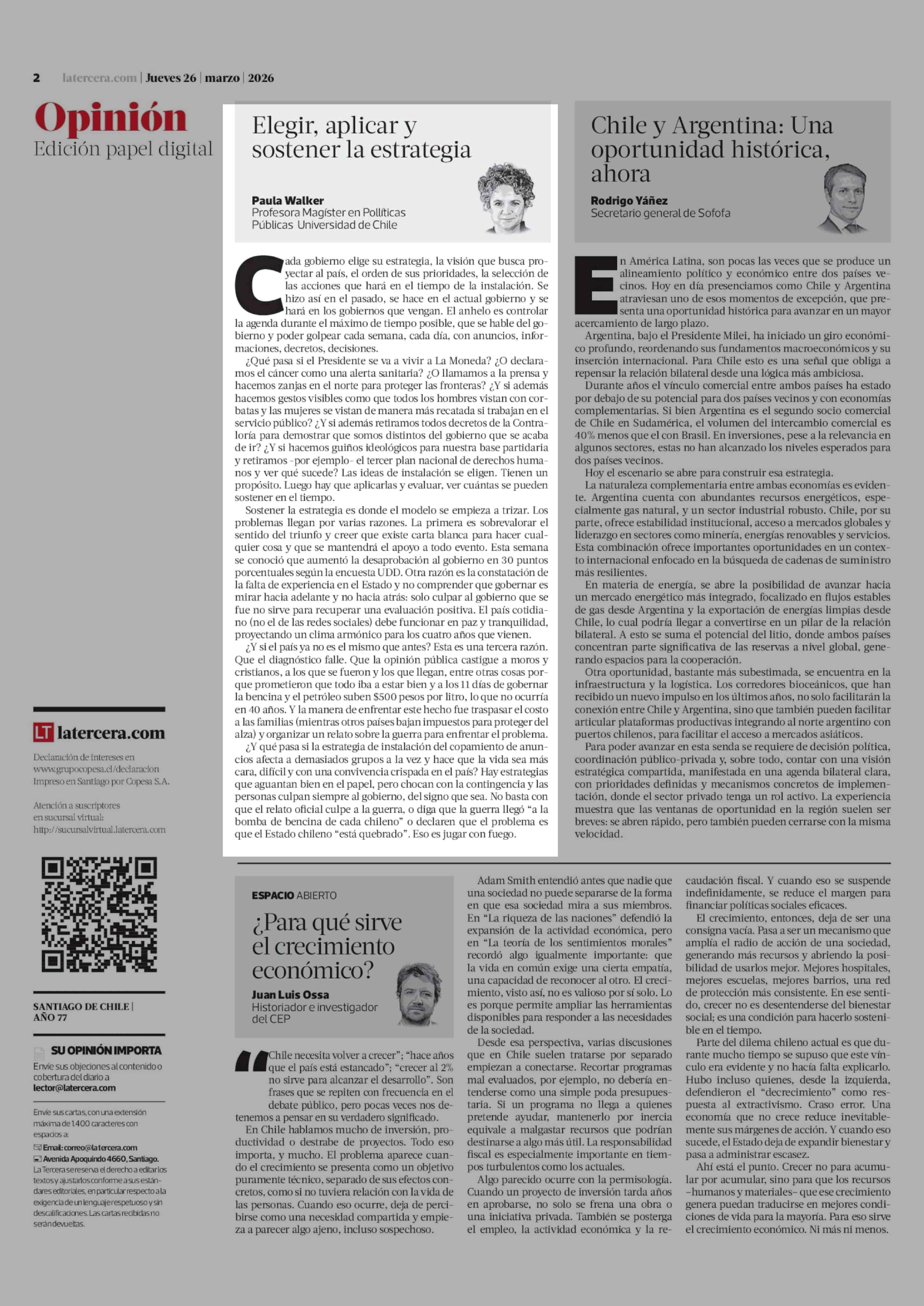 Columnas de Opinión: Elegir, aplicar y sostener la estrategia 26-03-2026 La Tercera |