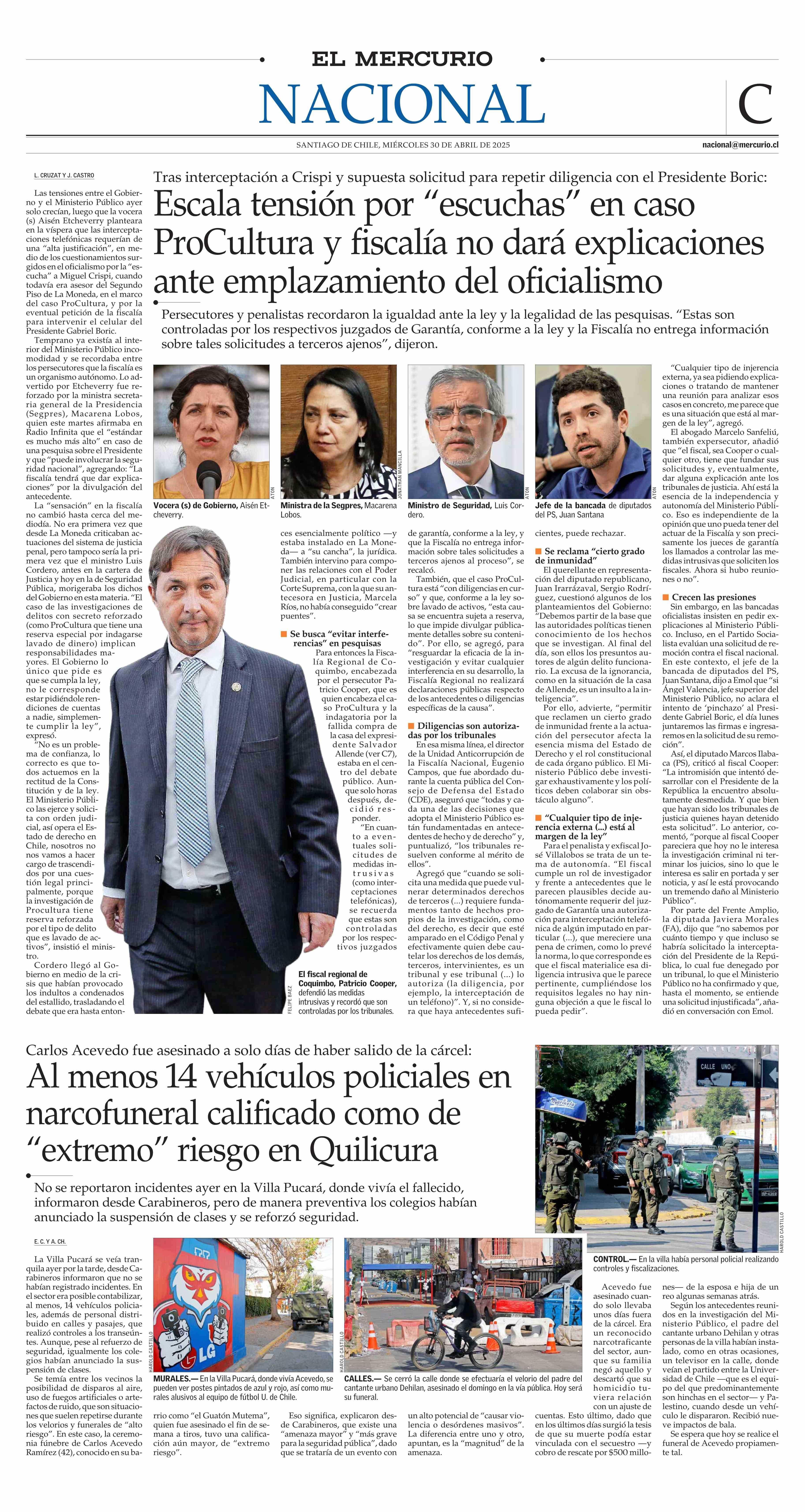 Al menos 14 vehículos policiales en narcofuneral calificado como de “extremo” riesgo en Quilicura 30-04-2025 El Mercurio |