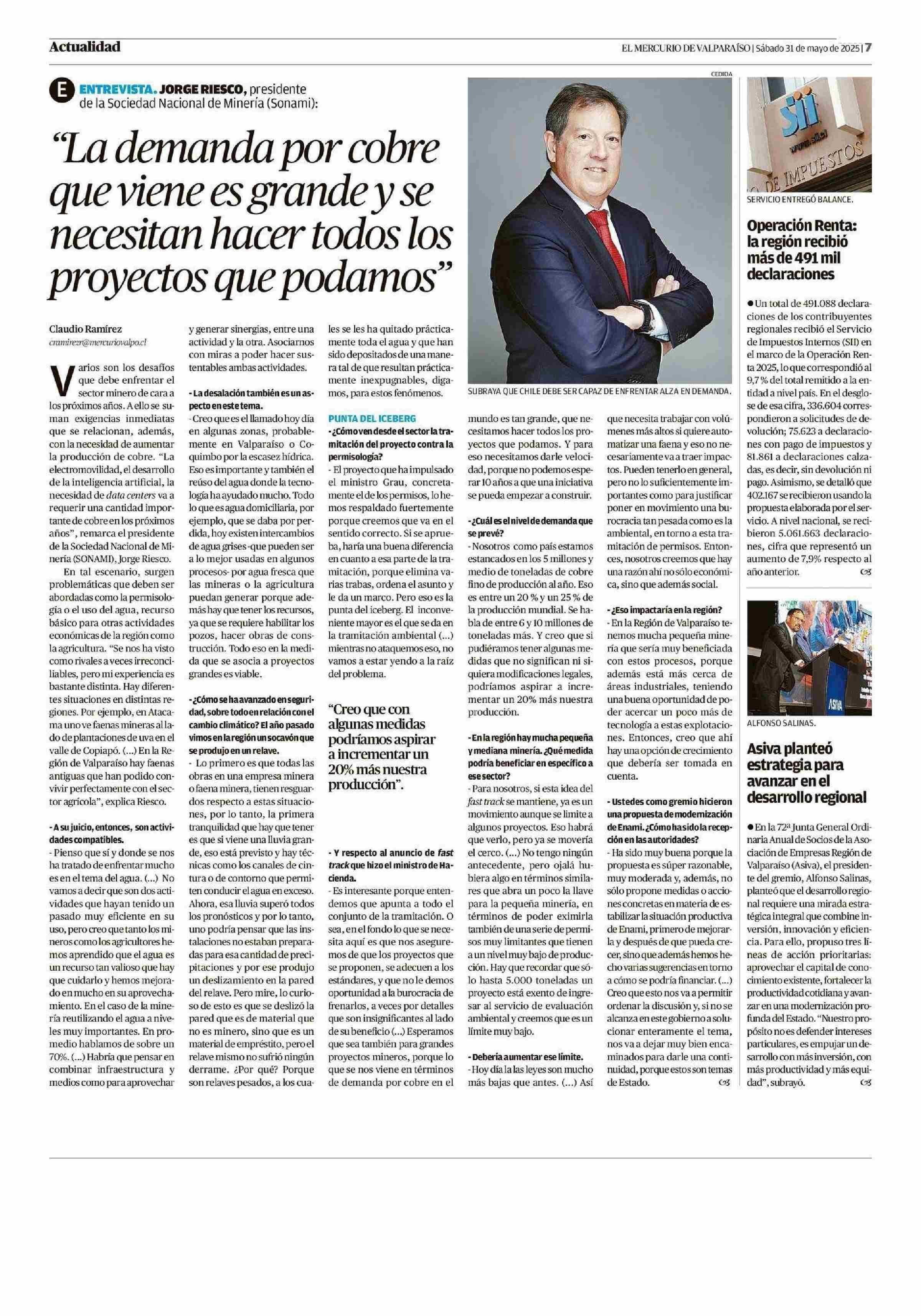 “La demanda por cobre que viene es grande y se necesitan hacer todos los proyectos que podamos” 31-05-2025 El Mercurio de Valparaíso |