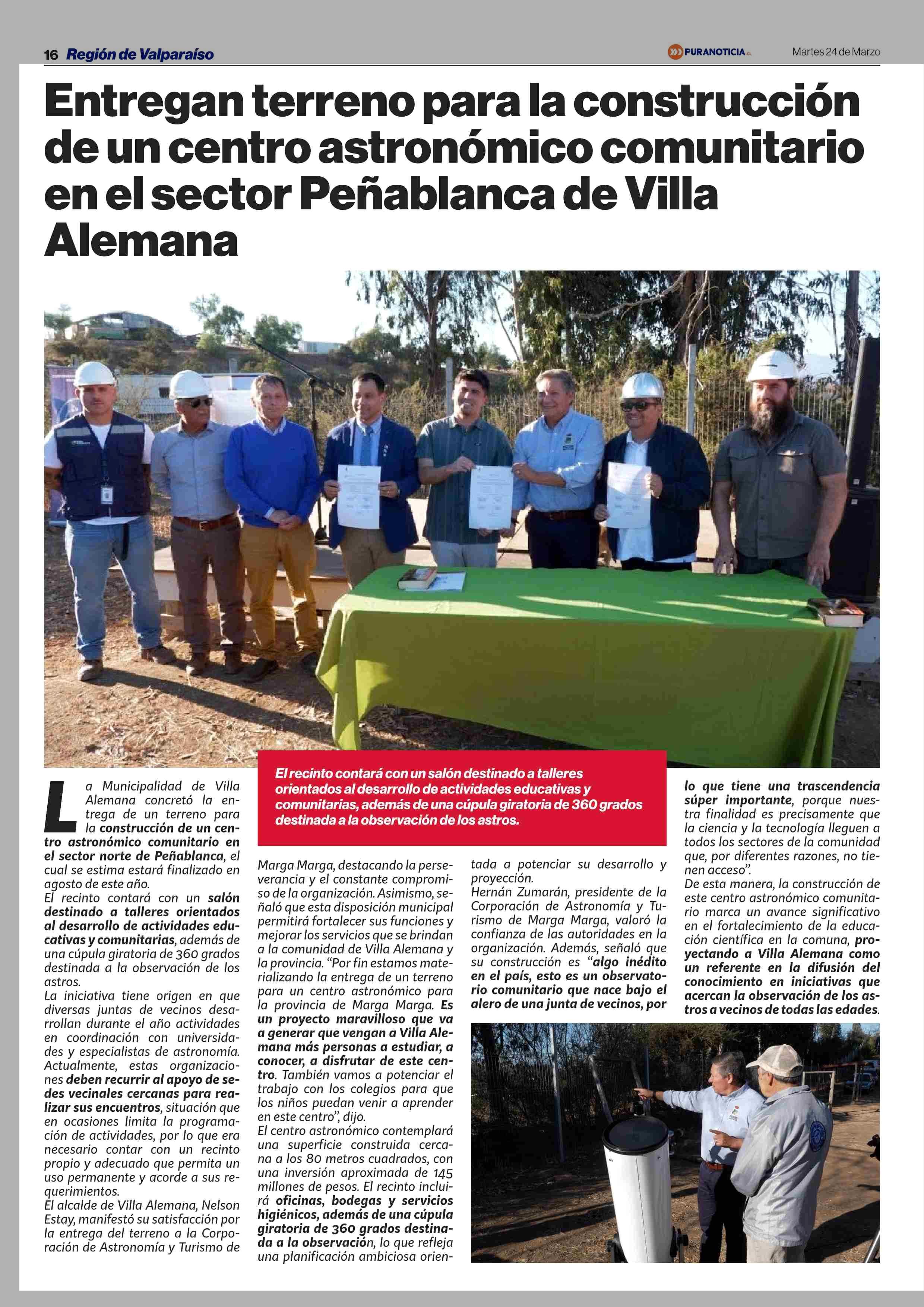 Entregan terreno para la construcción de un centro astronómico comunitario en el sector Peñablanca de Villa Alemana 24-03-2026 Puranoticia.cl |