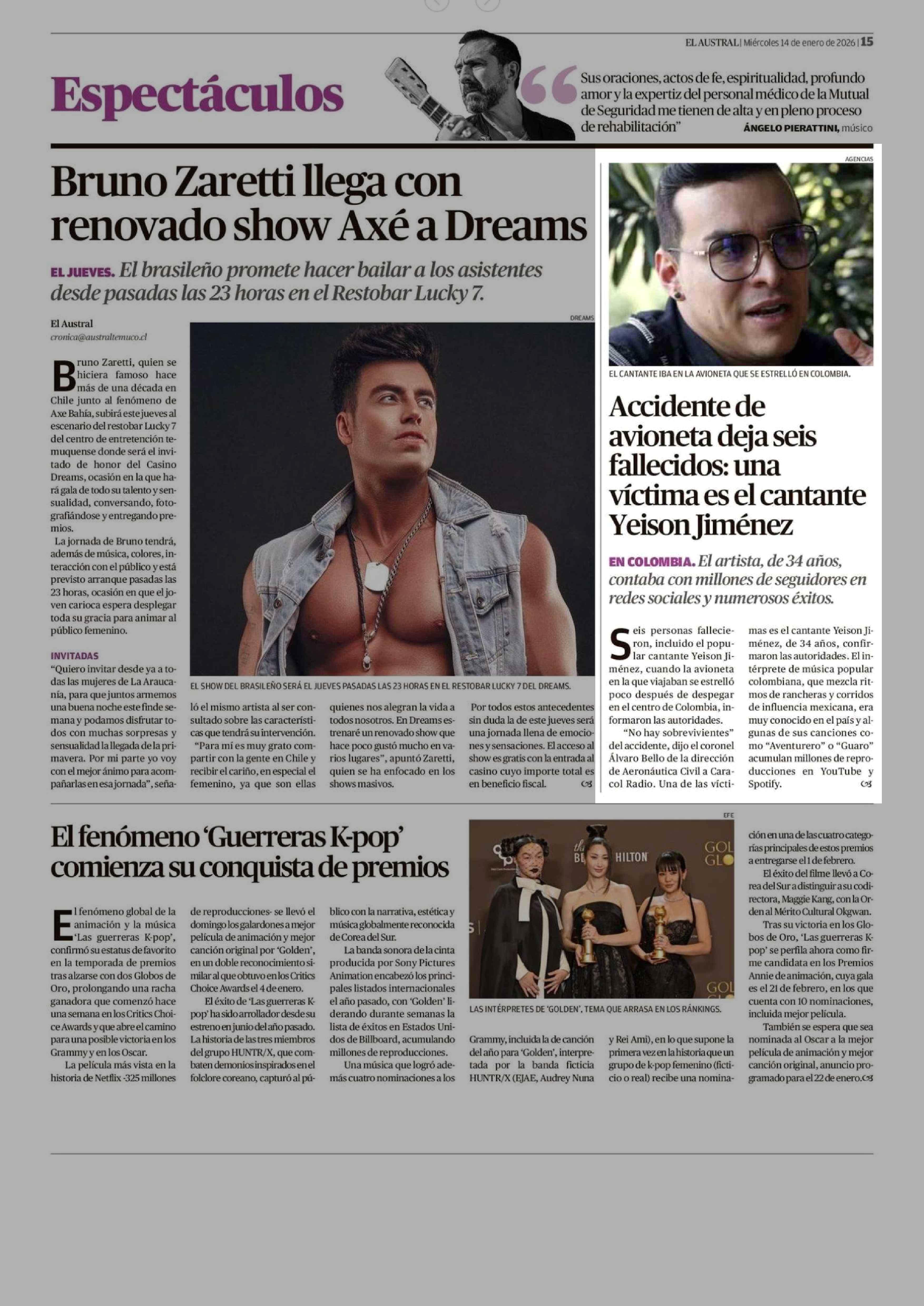 Accidente de avioneta deja seis fallecidos: una víctima es el cantante Yeison Jiménez 14-01-2026 El Austral de la Araucanía |