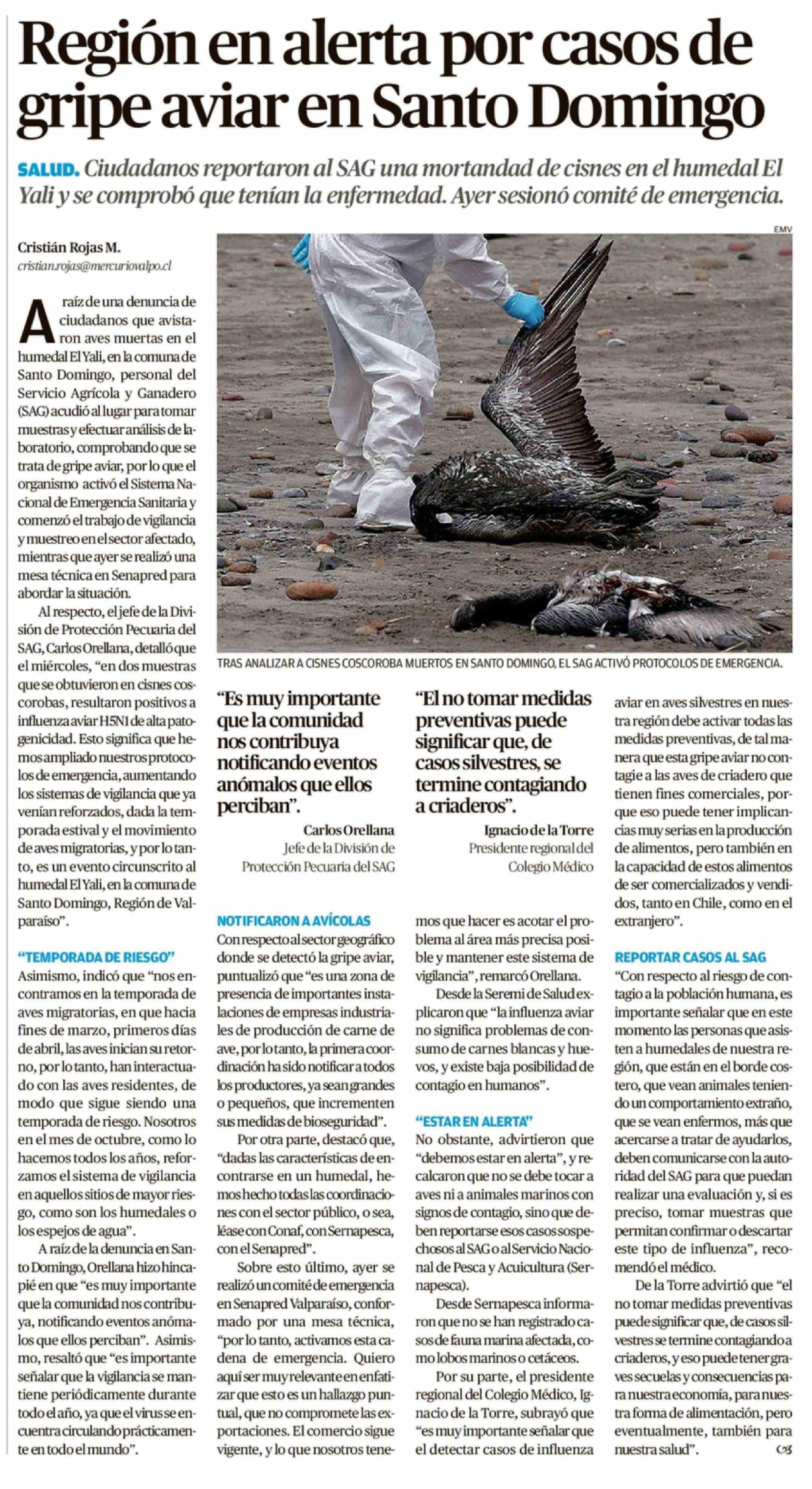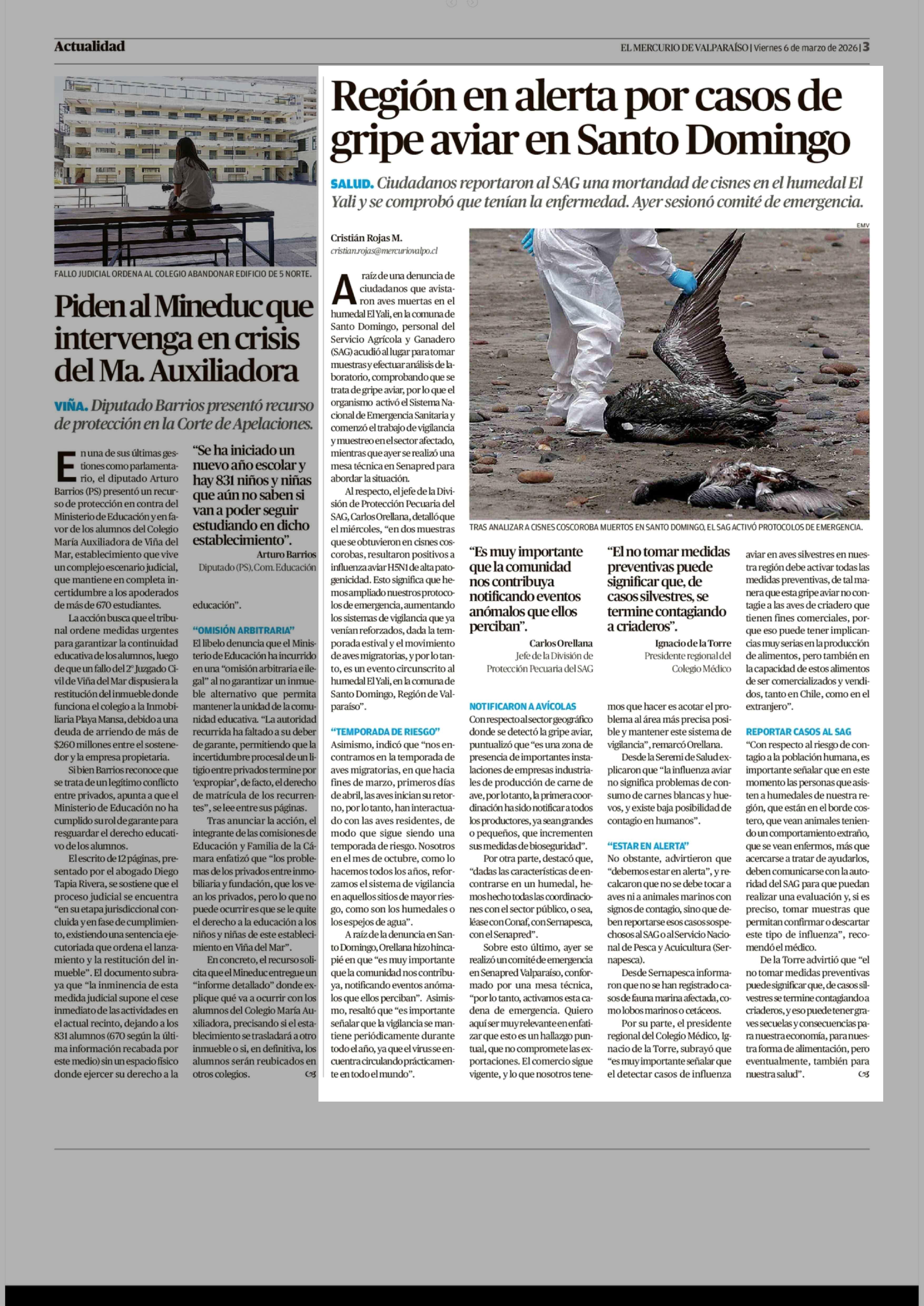 Región en alerta por casos de gripe aviar en Santo Domingo 06-03-2026 El Mercurio de Valparaíso |