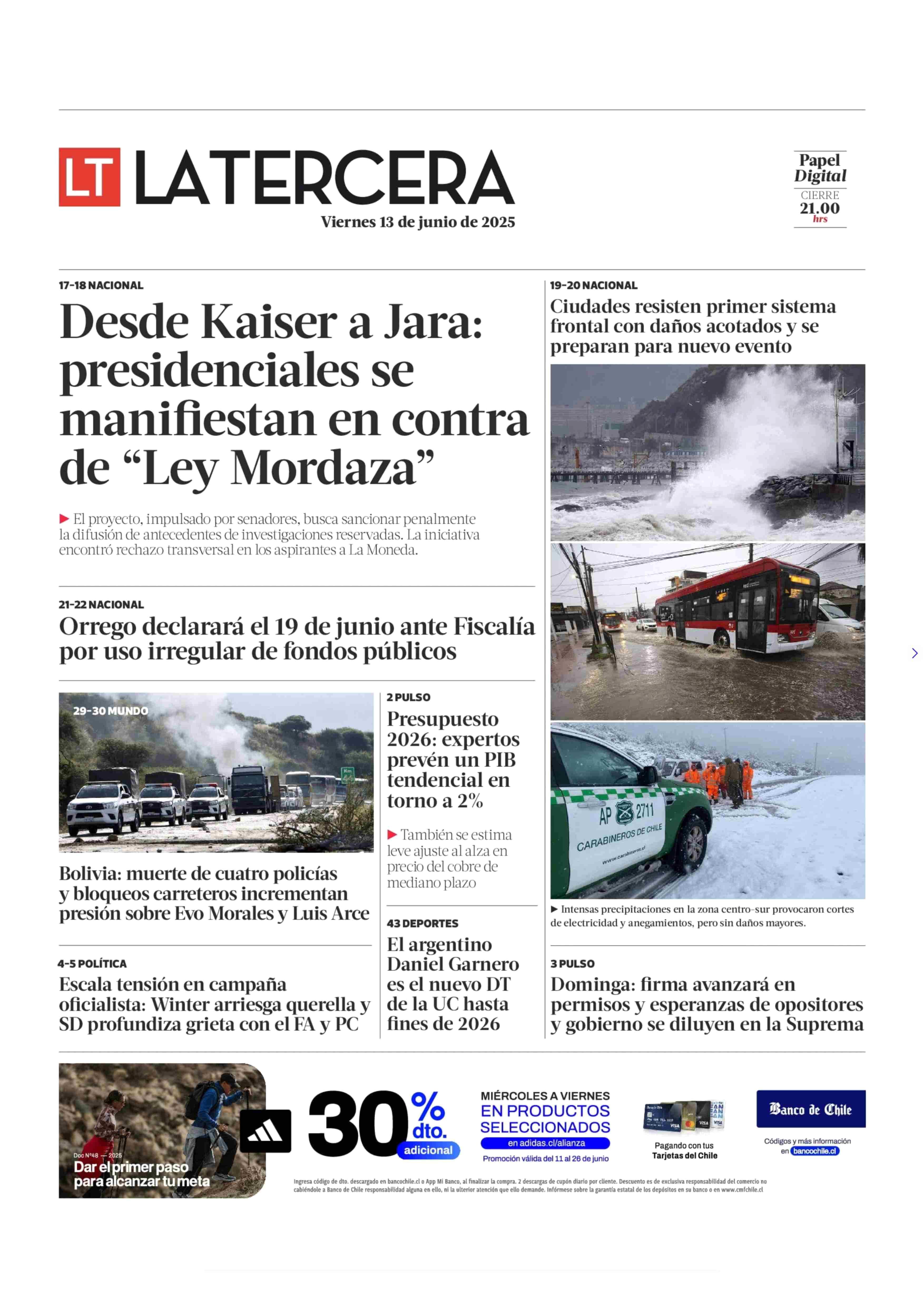 PORTADA LA TERCERA CHILE 13-06-2025 La Tercera |