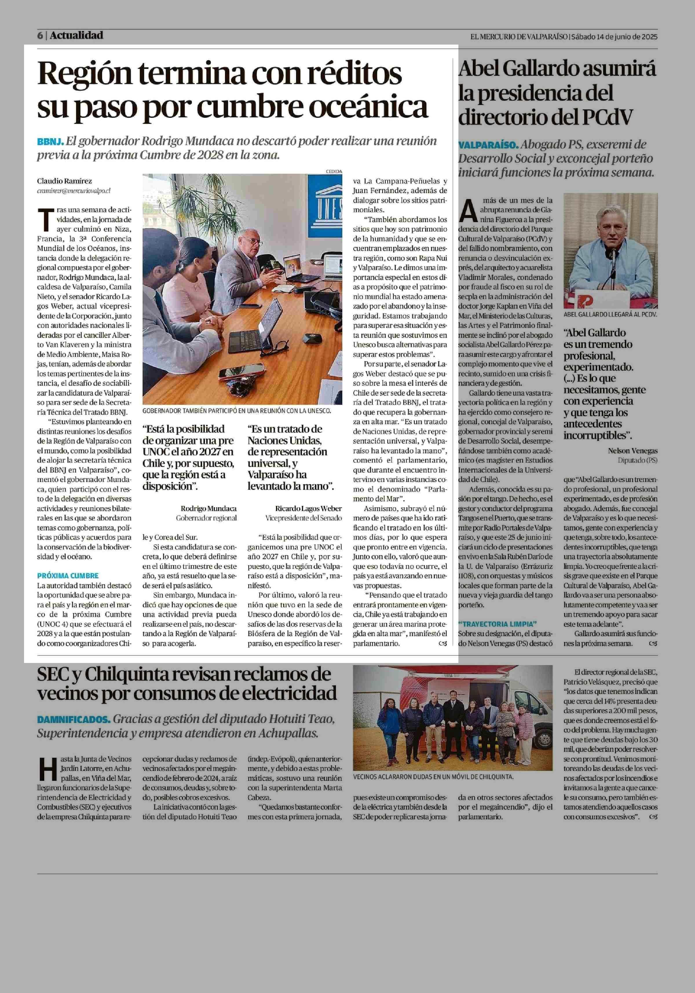 Región termina con réditos su paso por cumbre oceánica 14-06-2025 El Mercurio de Valparaíso |