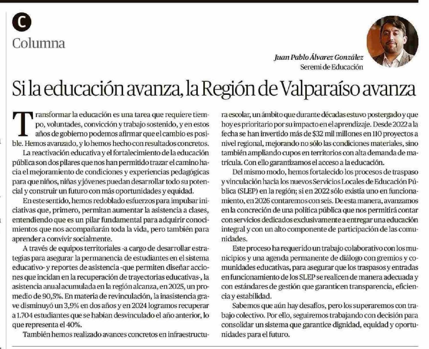 Columnas de Opinión: Si la educación avanza, la Región de Valparaíso avanza 20-06-2025 El Mercurio de Valparaíso |