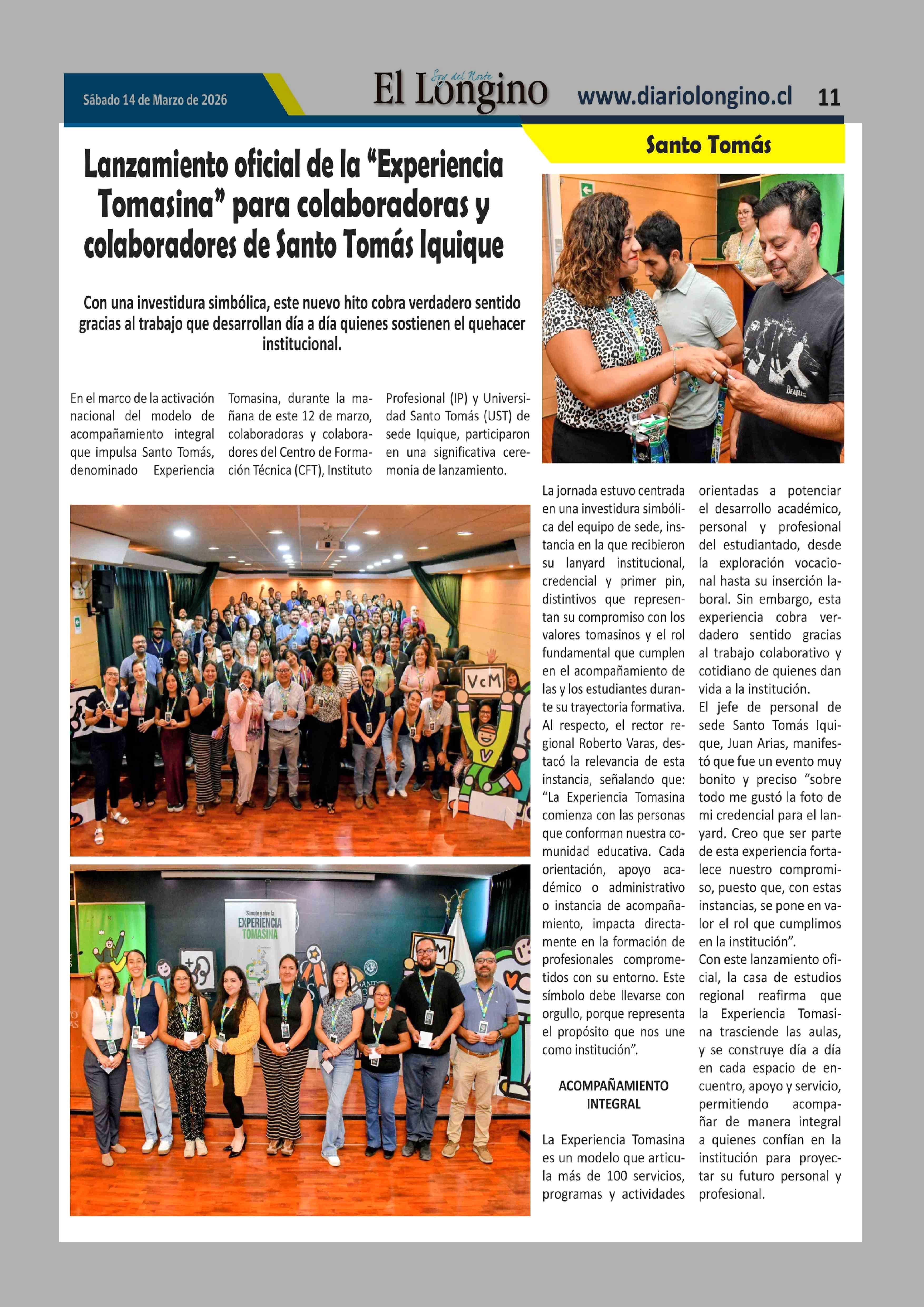 Lanzamiento oficial de la "Experiencia Tomasina" para colaboradoras y colaboradores de Santo Tomás Iquique 14-03-2026 El Longino |