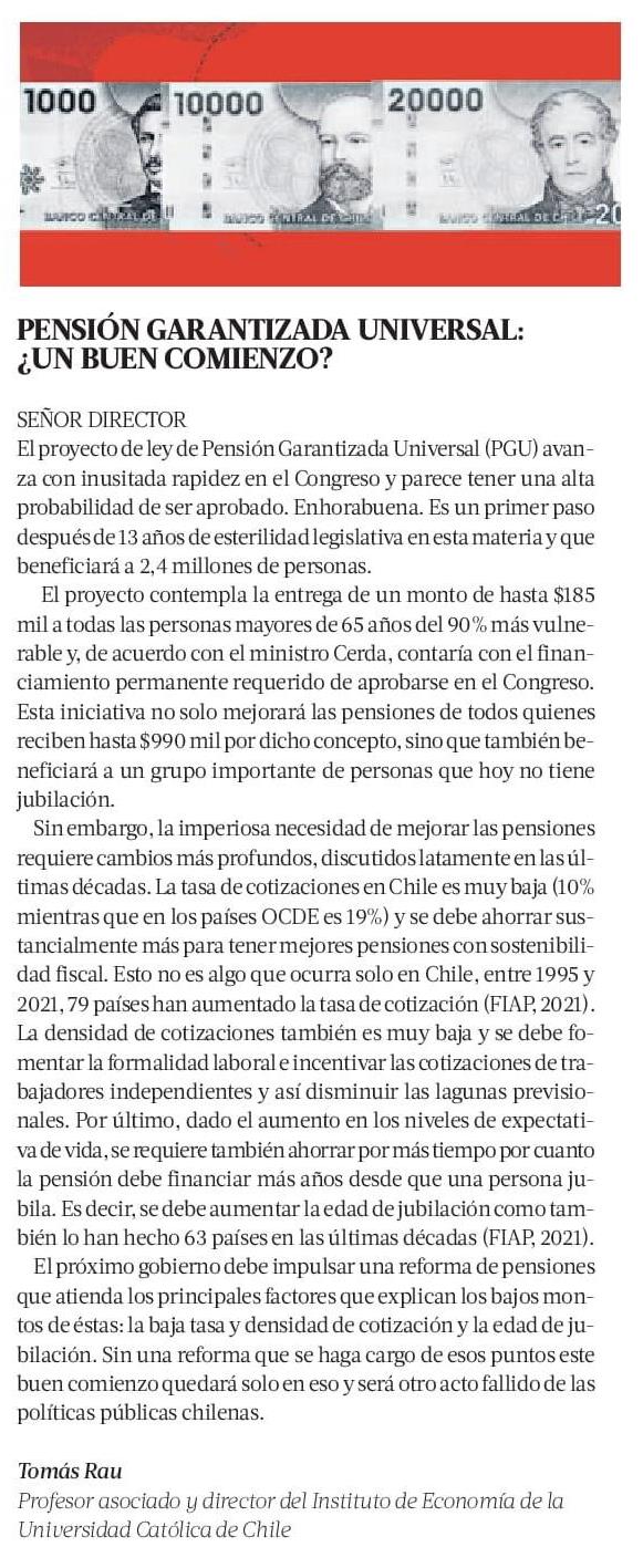 PENSIÓN GARANTIZADA UNIVERSAL: ¿UN BUEN COMIENZO? 26-12-2021 La Tercera |
