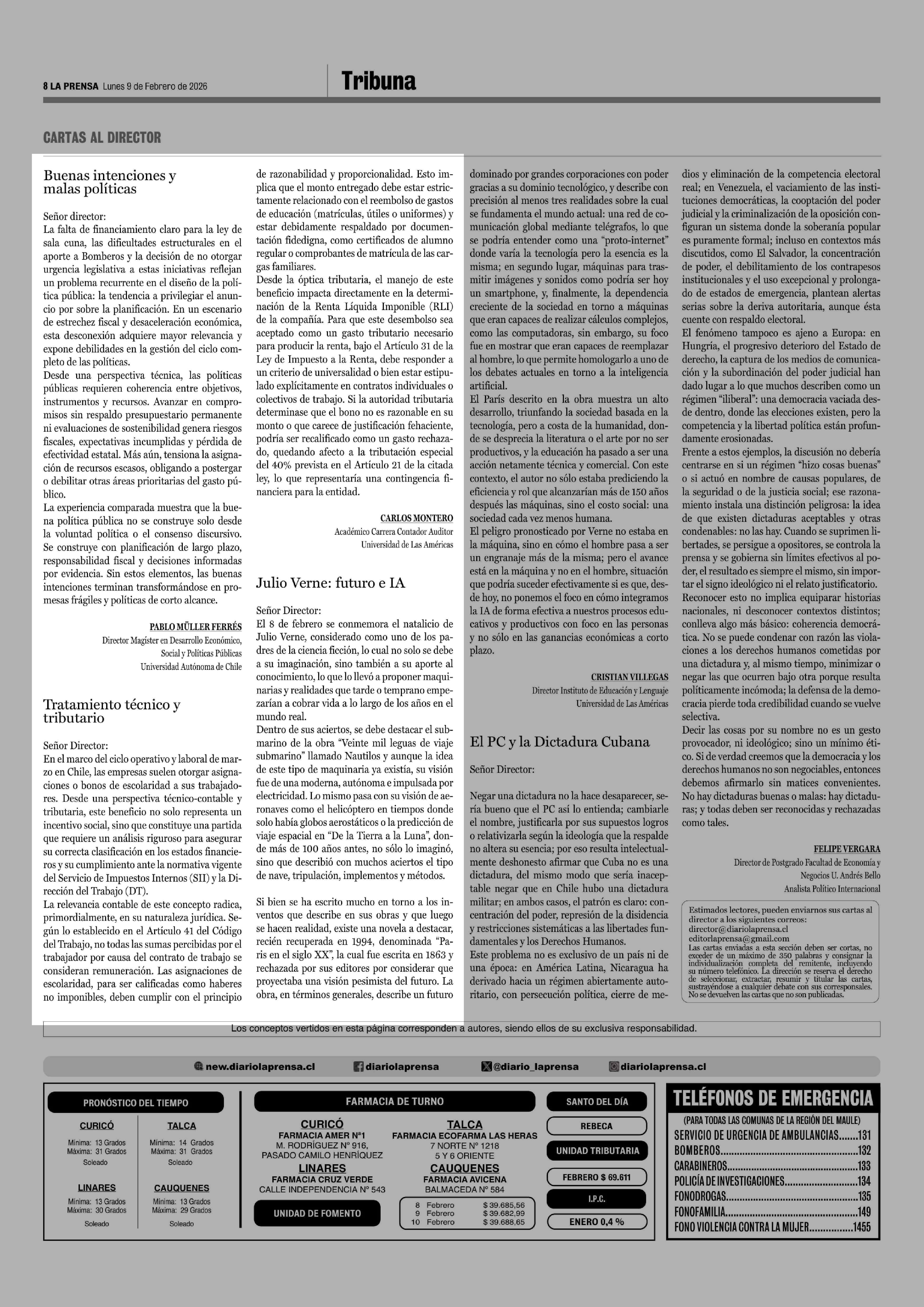 Cartas: Tratamiento técnico y tributario 09-02-2026 La Prensa de Curicó |