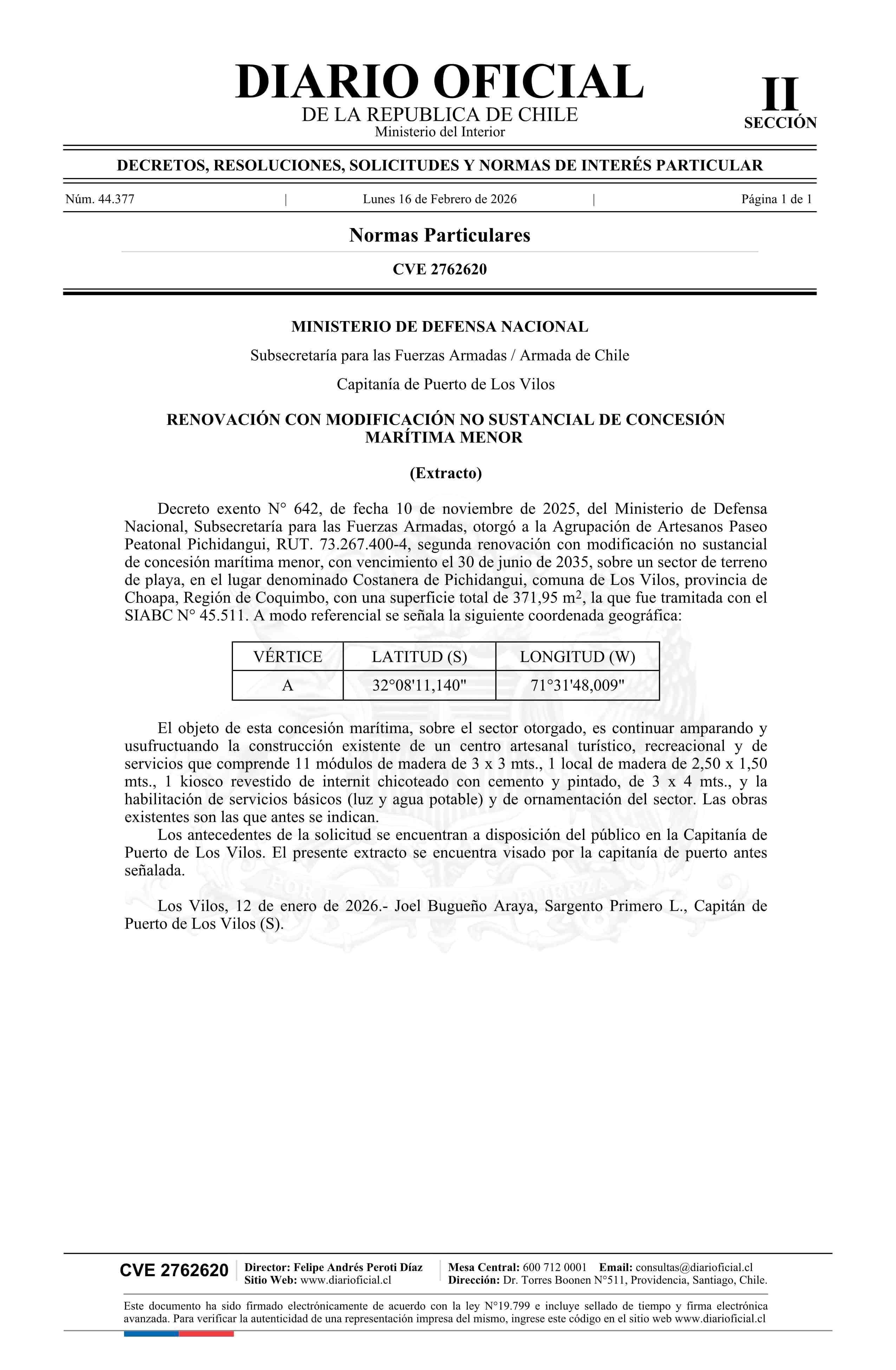 | Título: | Extracto de decreto exento número 642, de 2025.- Renovación con modificación no sustancial de concesión marítima menor |
